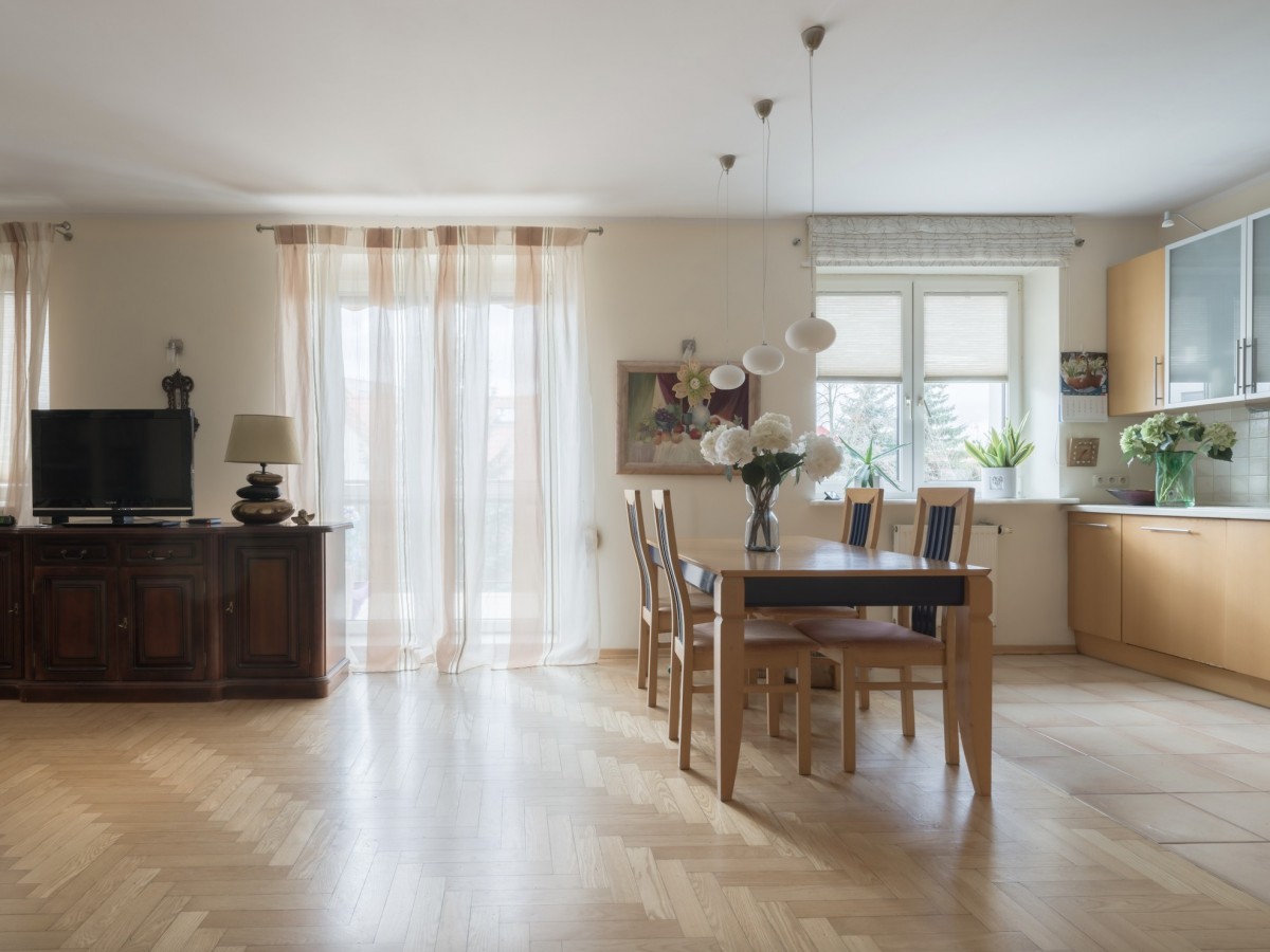 Wnętrze wykończone jest w klasycznym standardzie – na podłogach znajduje się naturalny parkiet, a wysokość pomieszczeń (2,65 m) zapewnia poczucie komfortu i przestrzeni. Ogrzewanie miejskie oraz dostęp do gazu stanowią dodatkowe atuty funkcjonalne.