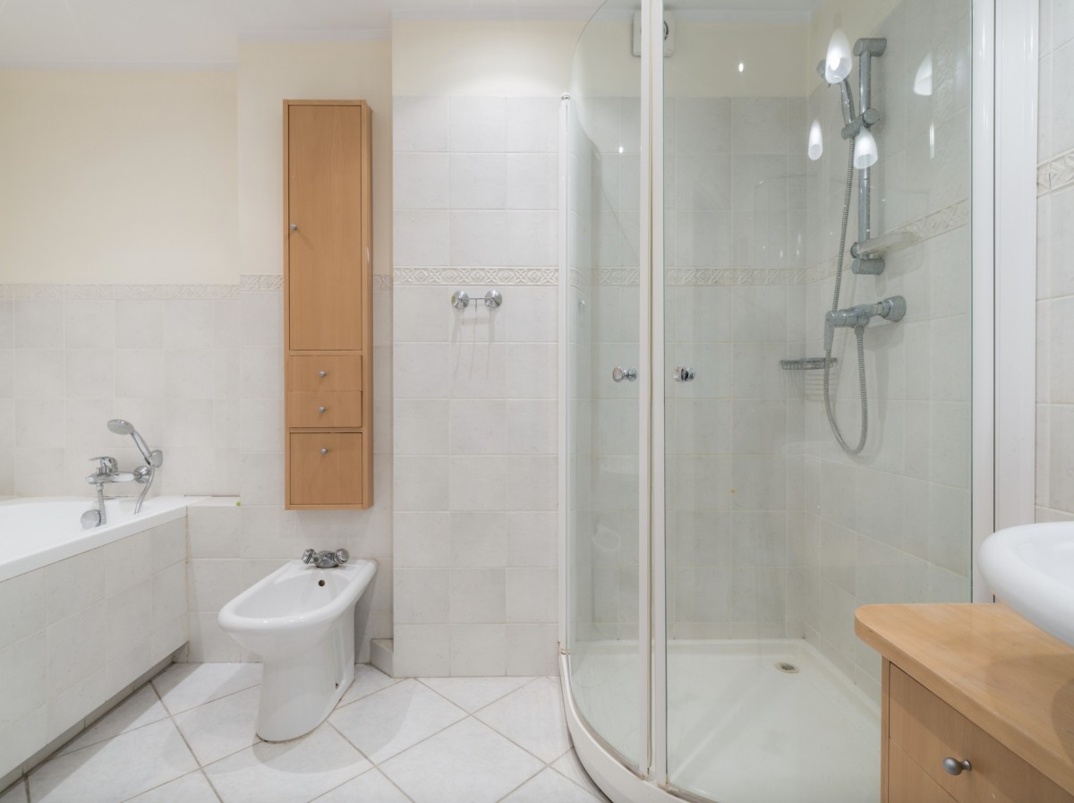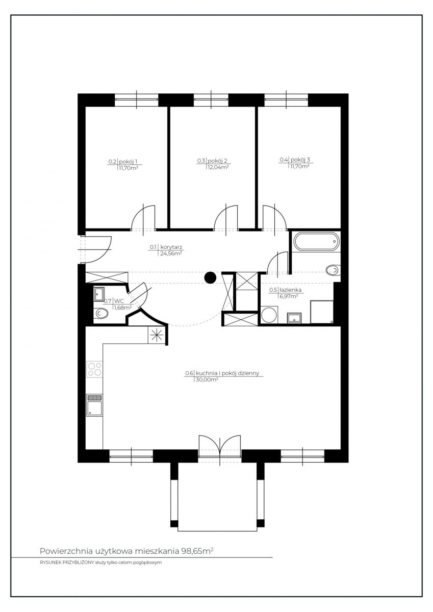 Przy wejściu do mieszkania znajduje się toaleta gościnna, natomiast w głębi zaplanowano łazienkę główną, co zwiększa komfort codziennego użytkowania.