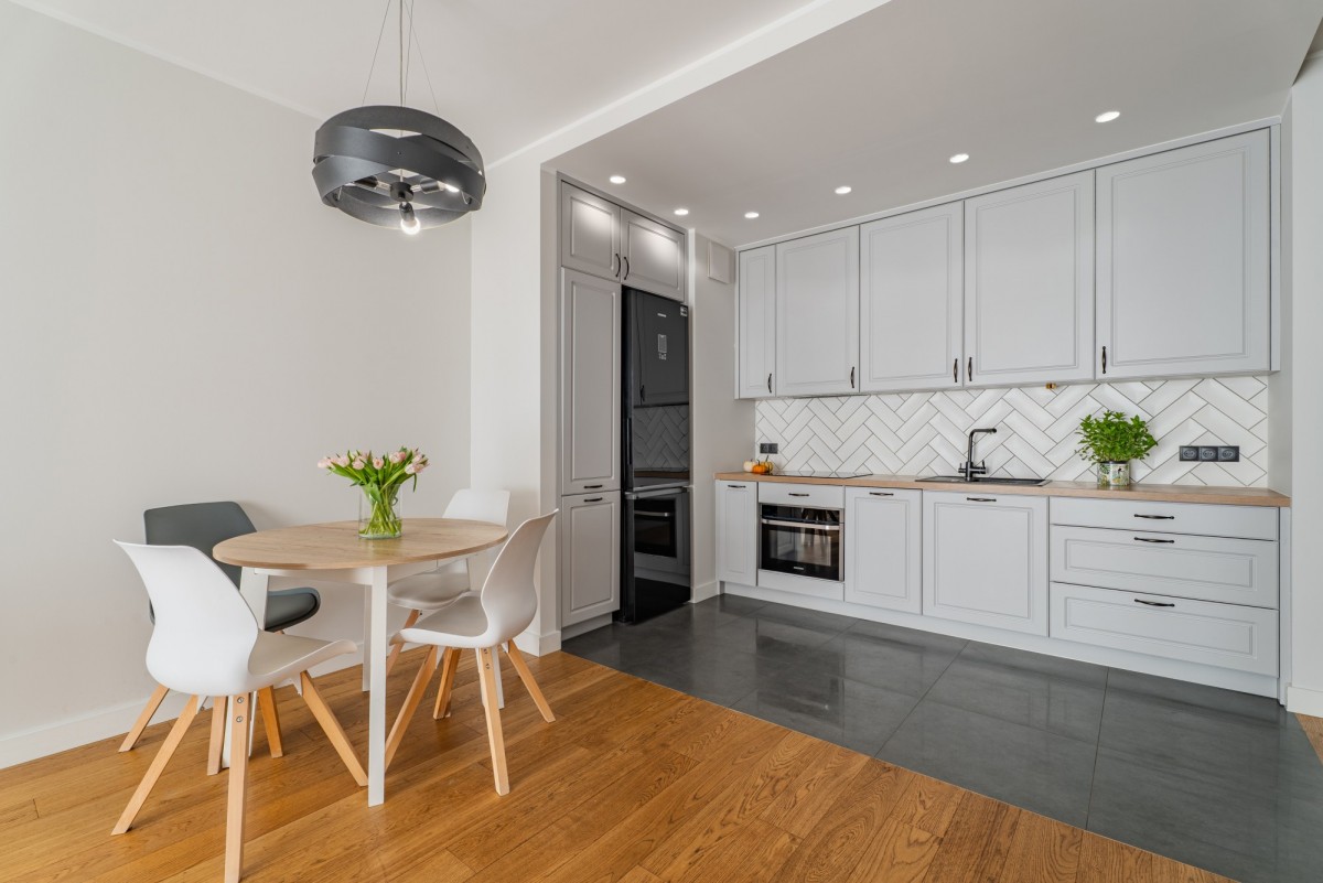 – jasny, przestronny salon z aneksem kuchennym, w pełni wyposażonym w sprzęty i wszystko niezbędne do codziennego funkcjonowania (naczynia, sztućce, zmywarka, piekarnik elektryczny, płyta indukcyjna, lodówka, zamrażarka), w salonie jest klimatyzacja (AC);