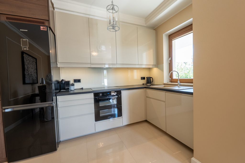 • Kuchnia z oknem i nowoczesną zabudową – jasna, elegancka i wygodna w codziennym użytkowaniu.