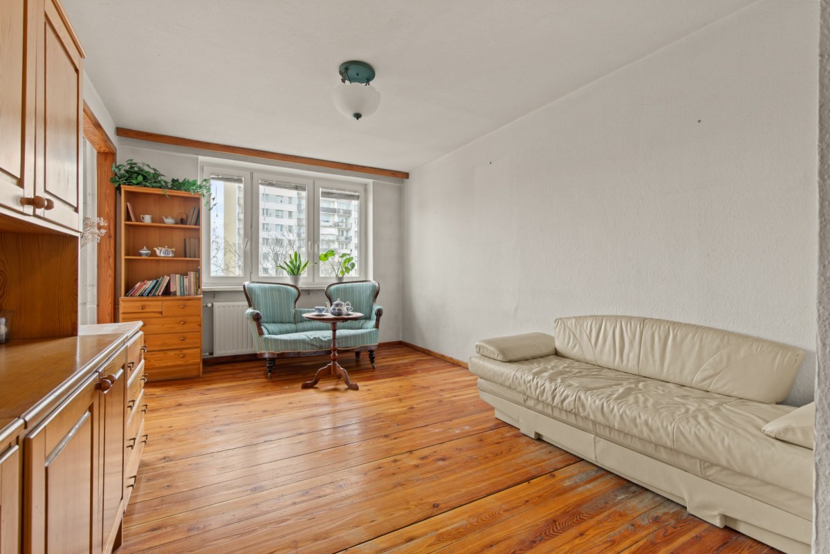 Mieszkanie z balkonem o ciekawym rozkładzie, w stanie do remontu. Na podłogach drewniana deska. Istnieje możliwość wydzielenia dodatkowego pokoju.