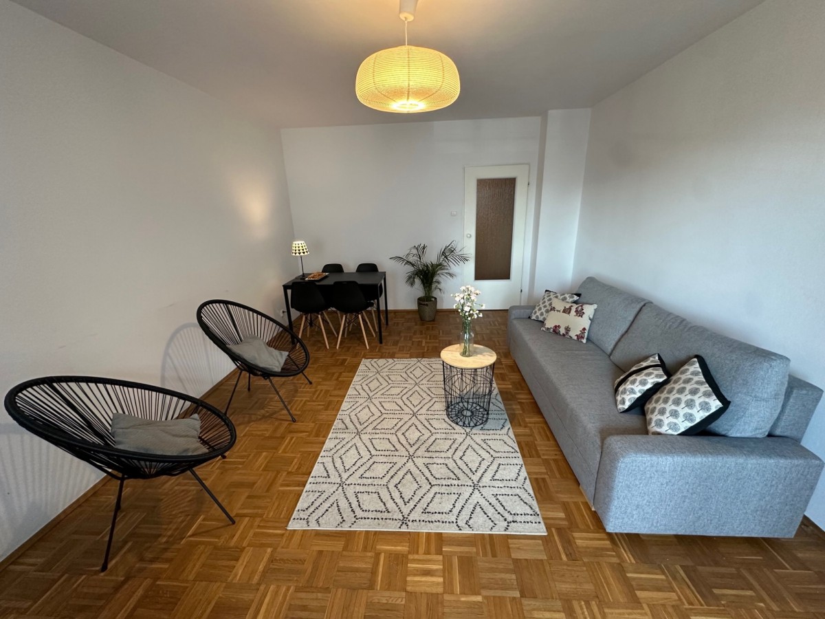 – Przytulnego salonu z dużą kanapą, dwoma fotelami, szafką RTV z telewizorem oraz stołu jadalnianego z kompletem krzeseł.