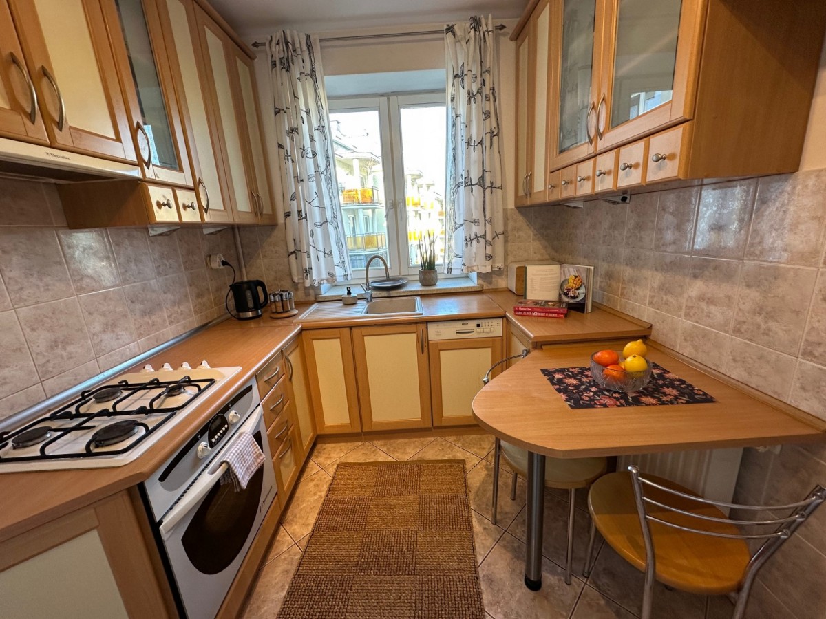 – Oddzielnej, widnej kuchni z podwójnym oknem, w pełni wyposażonej w sprzęt AGD (lodówka, zamrażalnik, kuchenka gazowa, zmywarka, okap, czajnik, talerze, garnki, przybory kuchenne) oraz stolikiem z dwoma krzesłami. Duża ilość szafek zapewnia wiele miejsca do przechowywania.