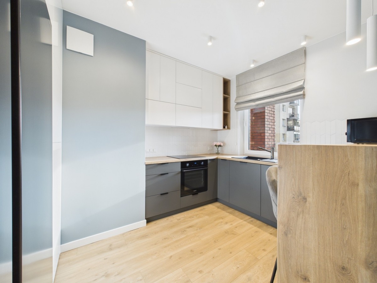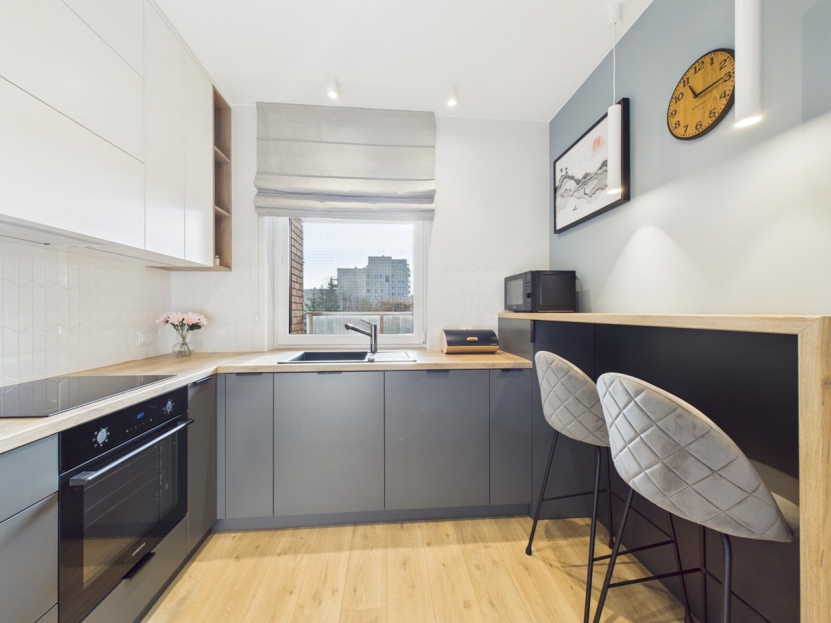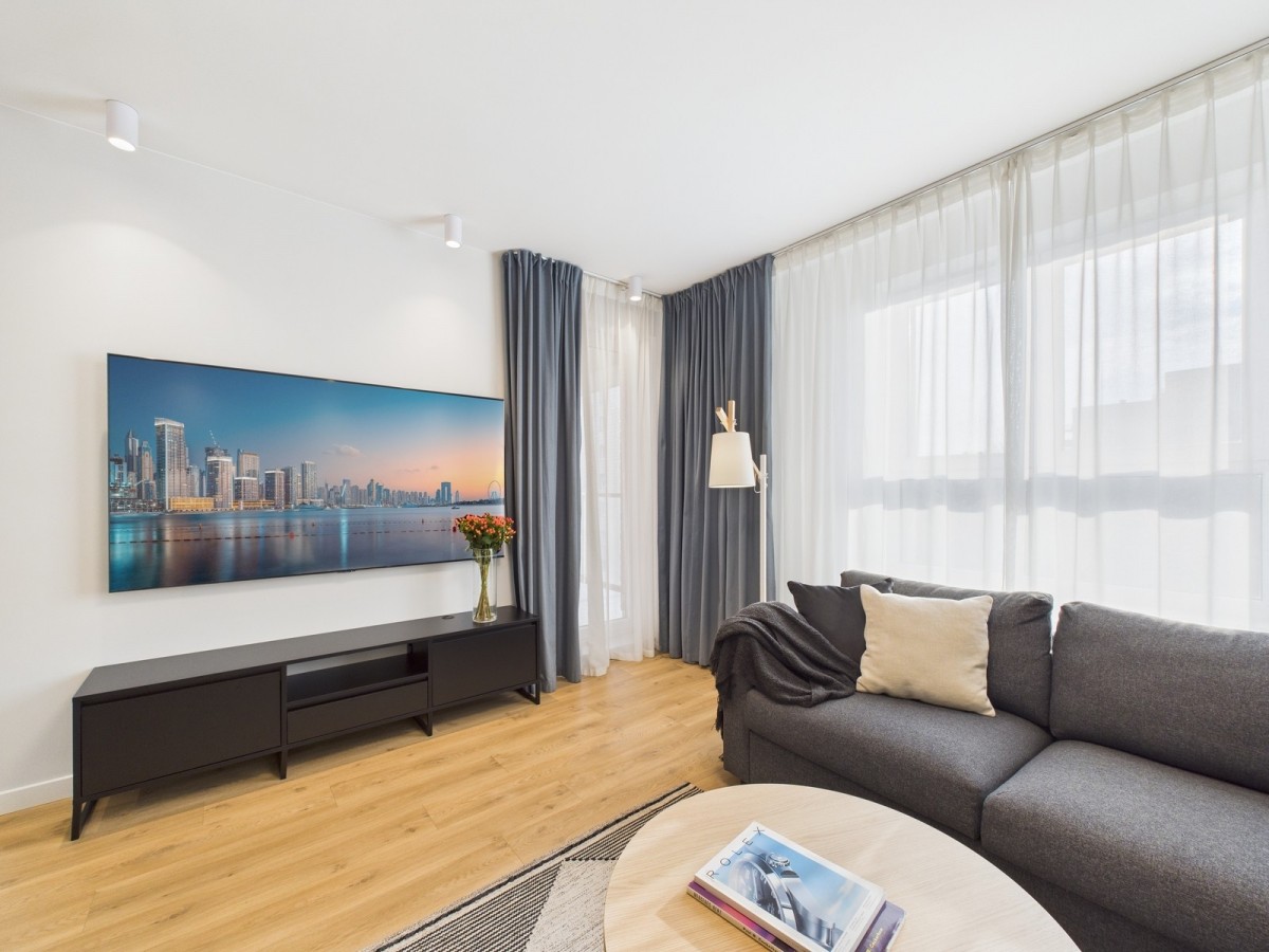 Apartament klimatyzowany, wykończony w wysokim standardzie – kuchnia wyposażona w wysokiej klasy sprzęt AGD. W mieszkaniu znajdują się dwie łazienki: jedna z wygodną wanną, druga z funkcjonalnym prysznicem.