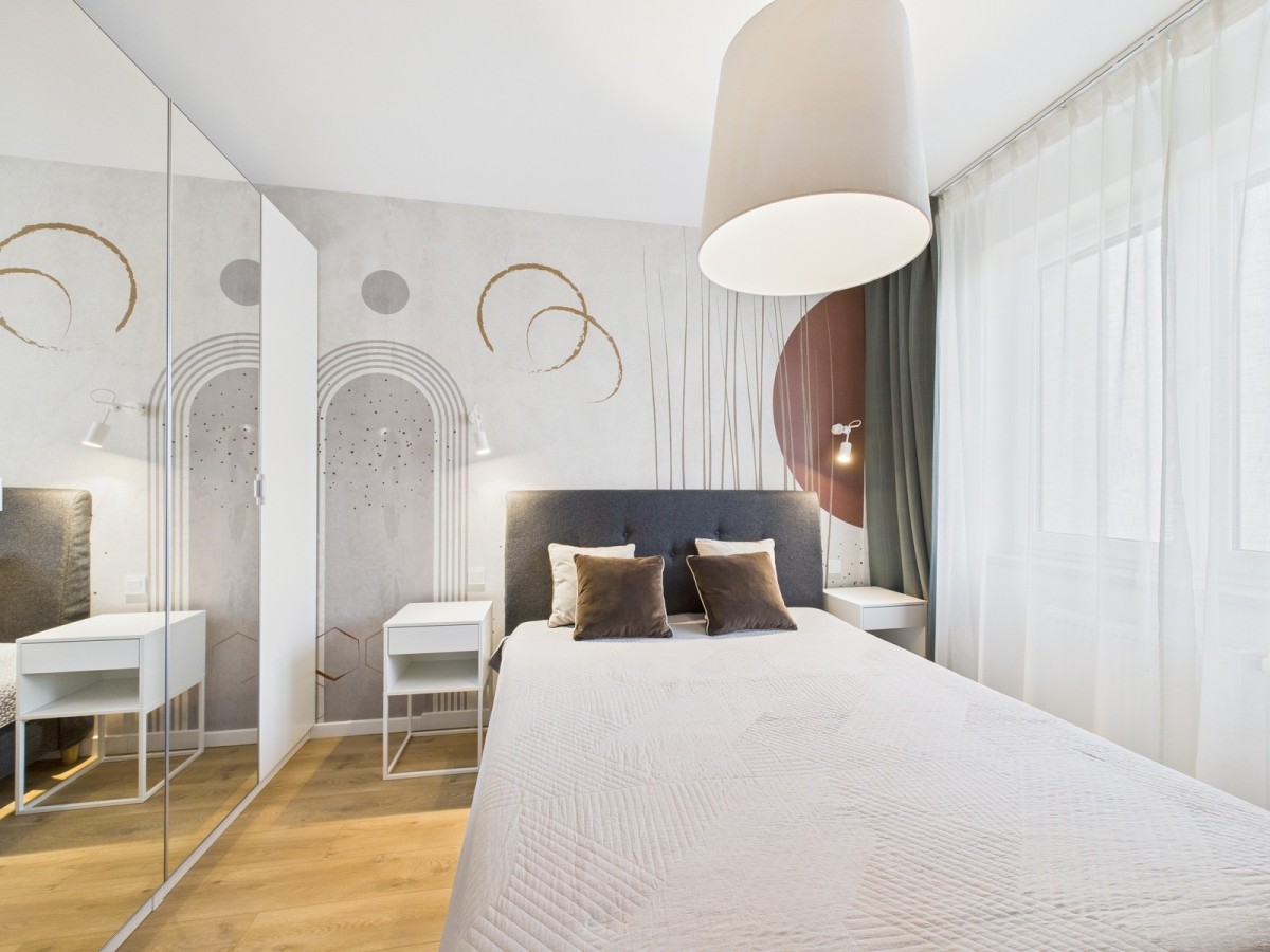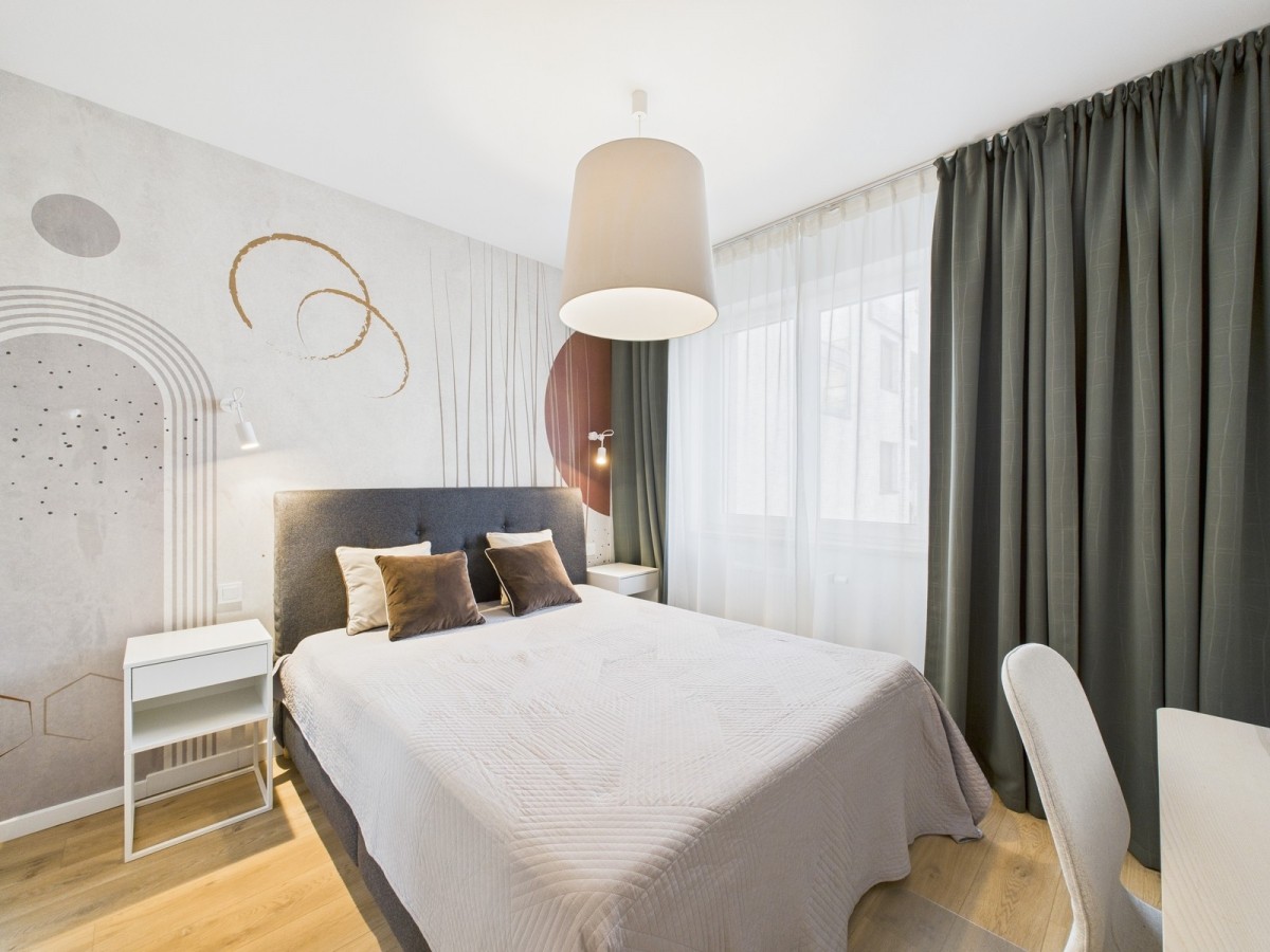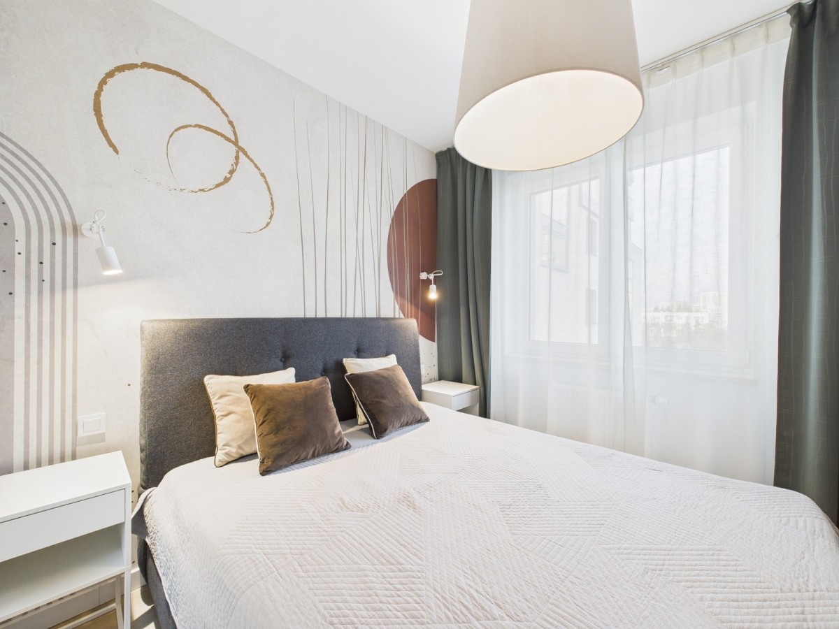 Apartament klimatyzowany, wykończony w wysokim standardzie – kuchnia wyposażona w wysokiej klasy sprzęt AGD. W mieszkaniu znajdują się dwie łazienki: jedna z wygodną wanną, druga z funkcjonalnym prysznicem.