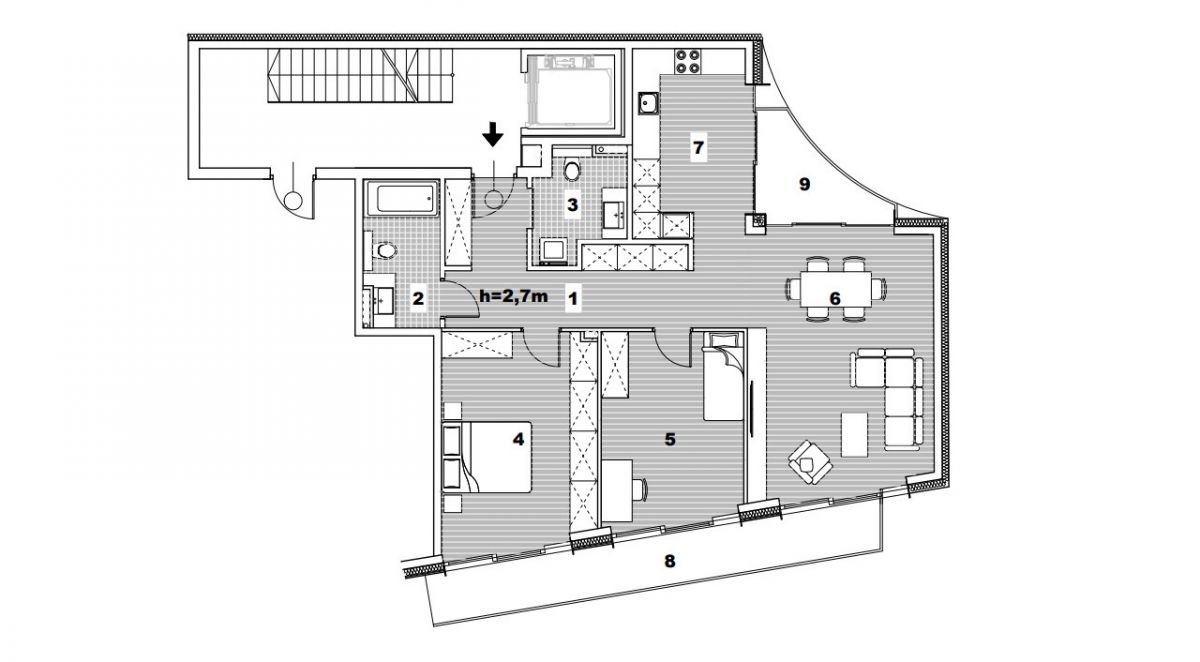 Z mieszkania wychodzą dwa balkony, jeden na stronę wschodnią, drugi na zachodnią.