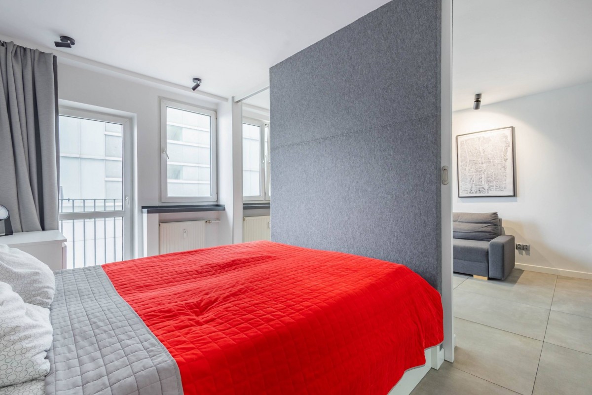Układ: Salon z aneksem kuchennym, oddzielna sypialnia, łazienka.