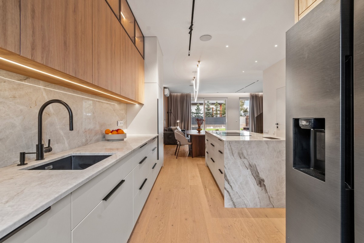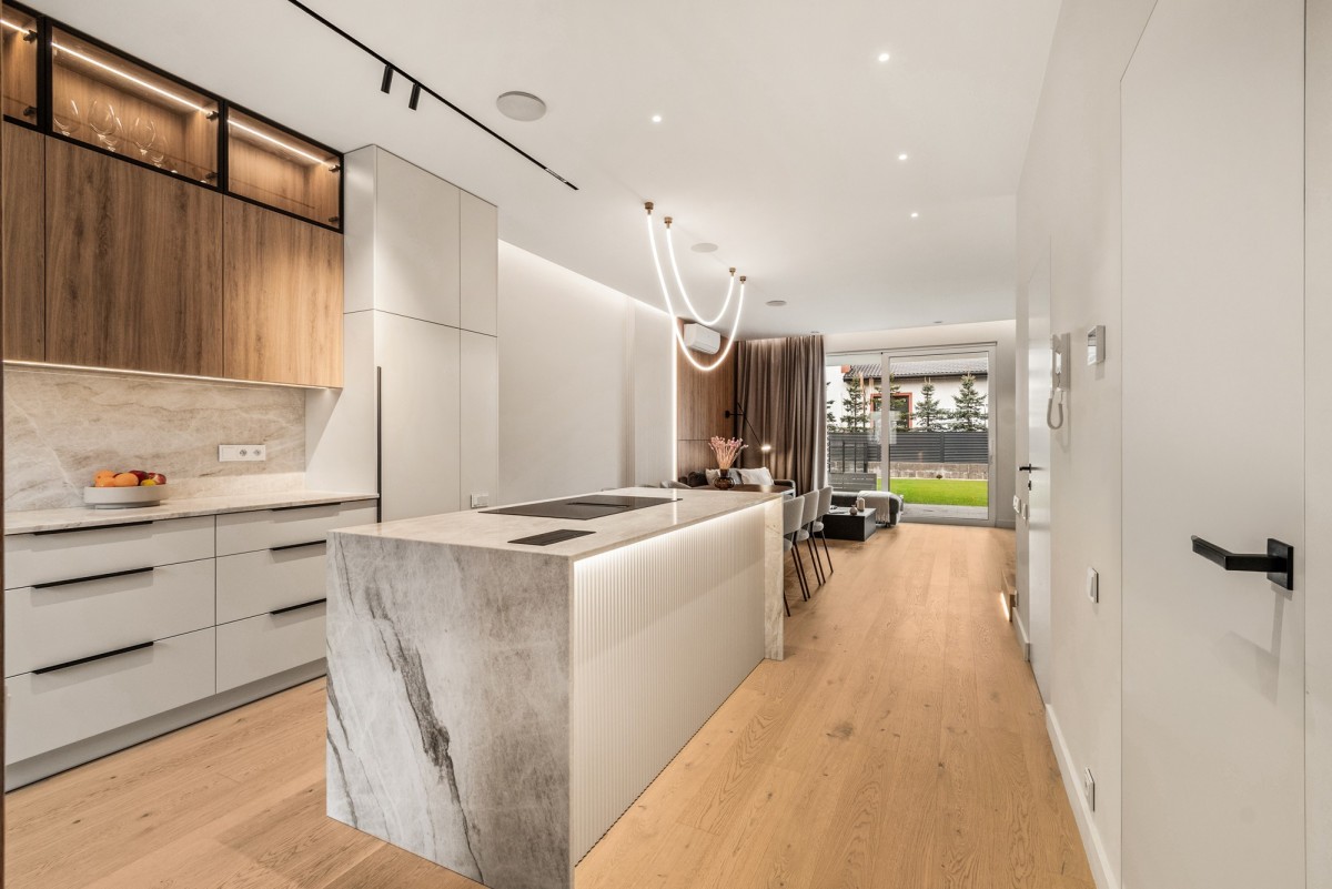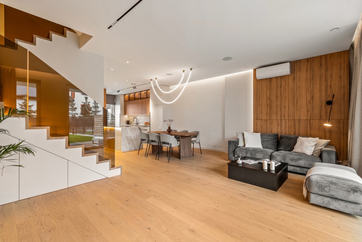 - przestronny salon z kominkiem, połączony z nowoczesną kuchnią (sprzęty Samsung i Electrolux, blaty z kwarcytu Taj Mahal)