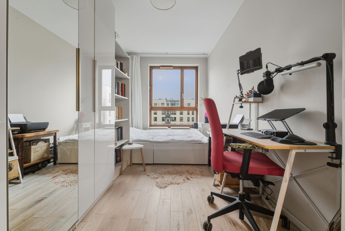 The apartment is situated on the 5th floor of a 6-story apartment building from 2014, in the intimate „Atelier Żoliborz” estate. The building is finished to a good standard, well-maintained, and secure – equipped with a modern elevator, monitoring, and security. Quiet and cozy – only 3 apartments per floor. Well-kept and nicely landscaped common areas and outdoor space between buildings. The apartment is very bright thanks to large windows with east/west exposure. The functional layout ensures comfort and privacy for residents.
