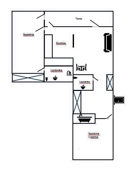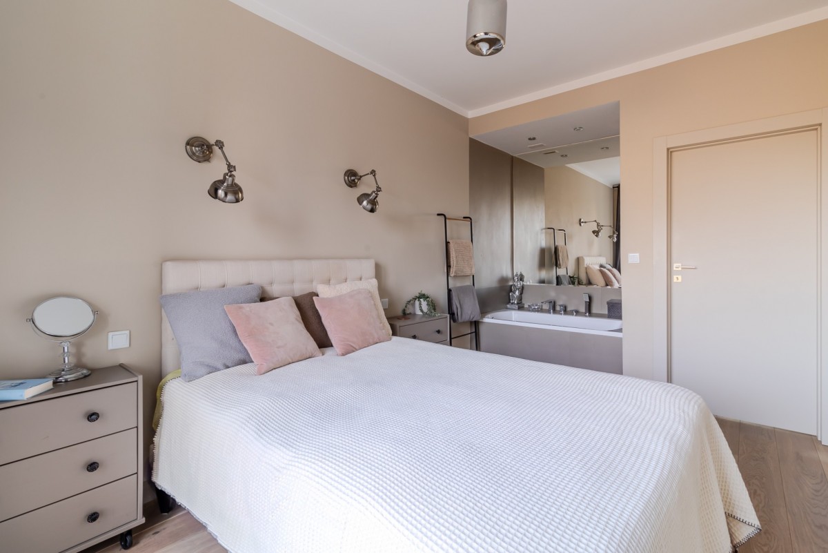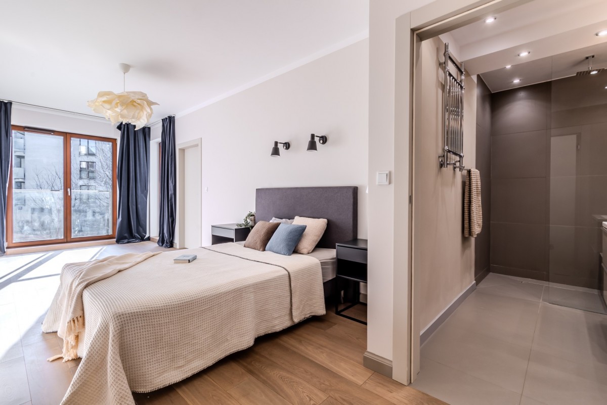 Mieszkanie ma świetny rozkład – jest podzielone na centralną, przestronną część dzienną oraz 2 komfortowe sypialnie z łazienkami, na przeciwległych krańcach mieszkania. Umożliwia to bezproblemowe funkcjonowanie 2 niezależnych osób czy par , które mogą korzystać ze wspólnej kuchni, salonu i tarasu .