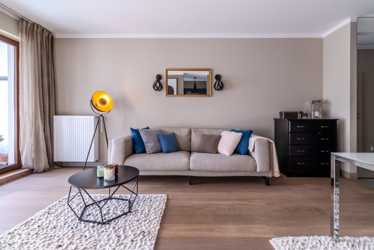 ✅ drewniane podłogi , neutralne kolory wnętrza .