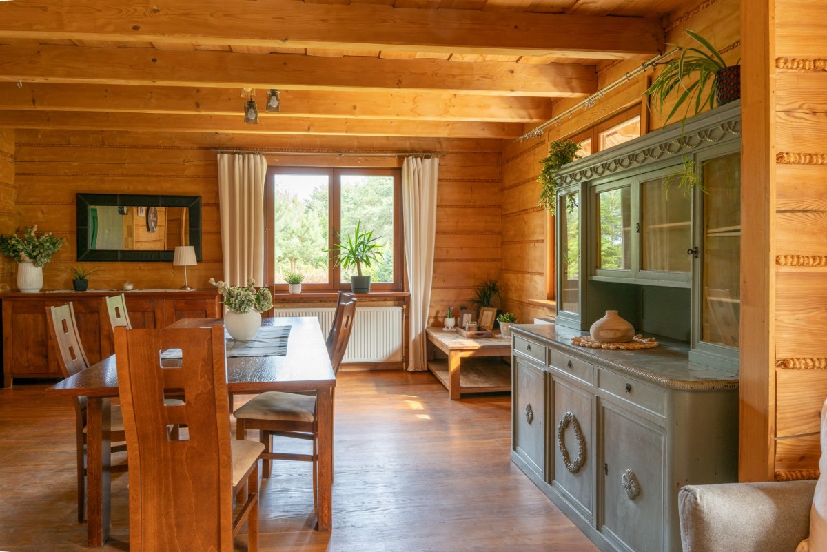 Ogrzewanie zapewnia piec na drewno (możliwość podłączenia gazu – przyłącze w drodze tuż przy bramie). Dom powstał z naturalnych, zdrowych materiałów, a jego konstrukcja gwarantuje niskie koszty eksploatacji. Całość domu wykończona została naturalnym drewnem – bale z mszeniem na zewnątrz i w środku, grube modrzewiowe i sosnowe deski podłogowe, jesionowe schody, na górze karton gips na konstrukcji drewnianej, a w łazienkach i kuchni gres. Ogród stanowią nieliczne krzewy i drzewa owocowe oraz praktyczna drewutnia. Przed domem rozległy podjazd z jasnego kruszywa – miejsca wystarczy także na budowę wiaty lub garażu.