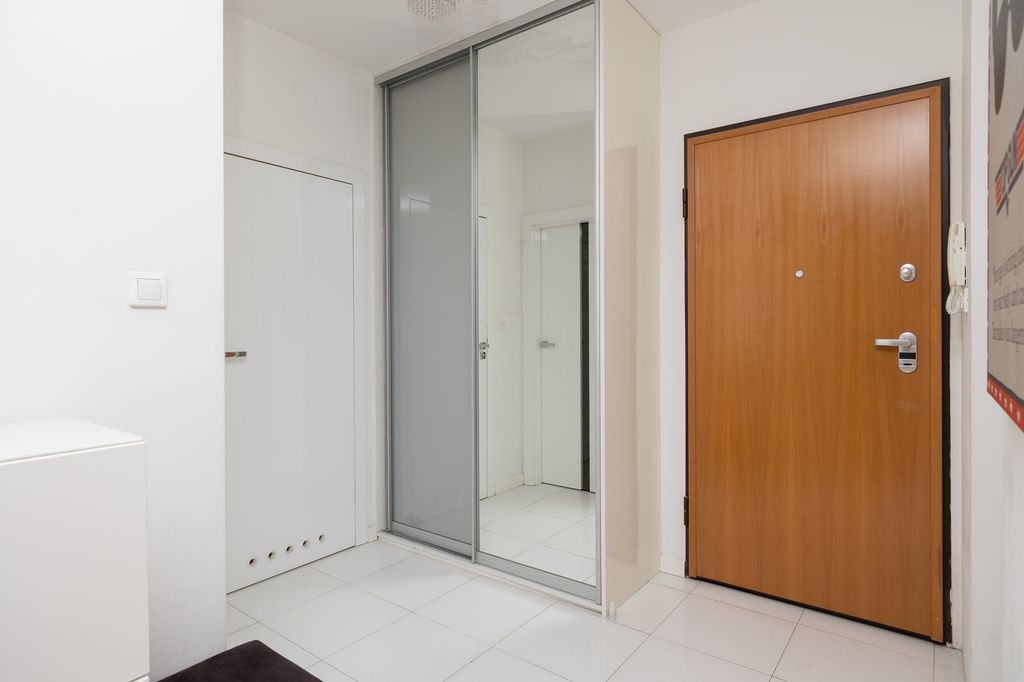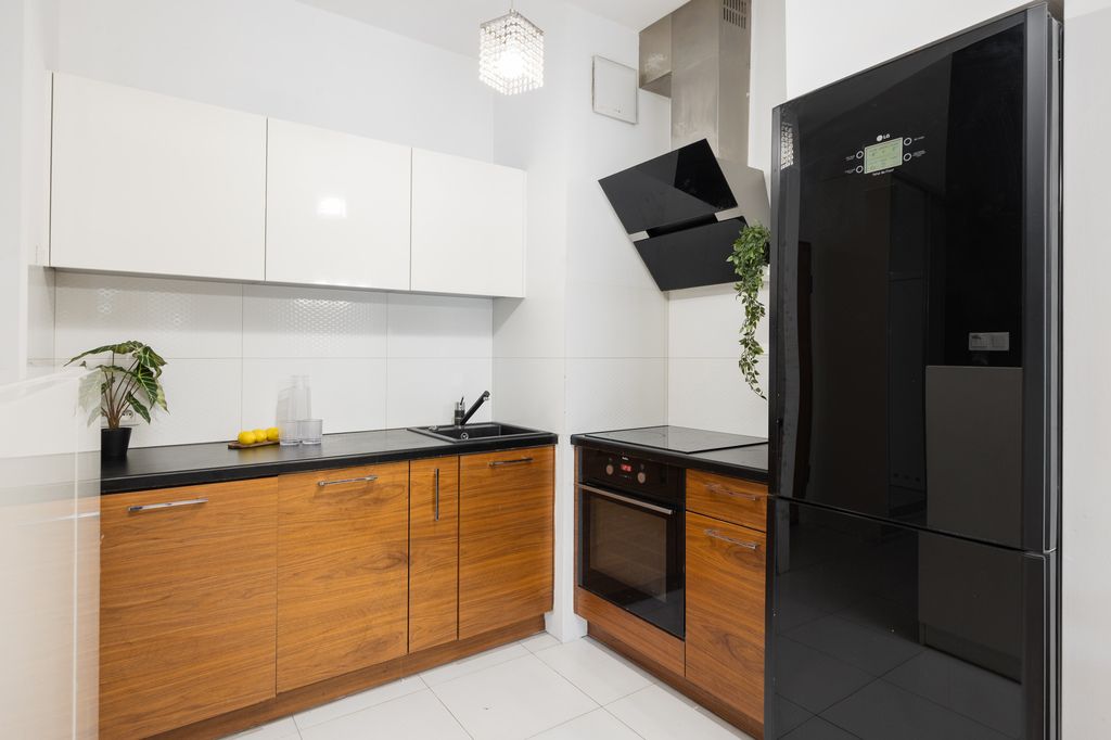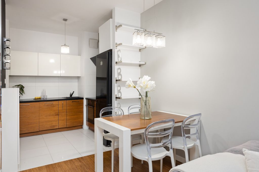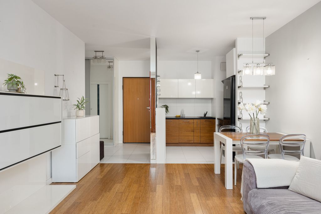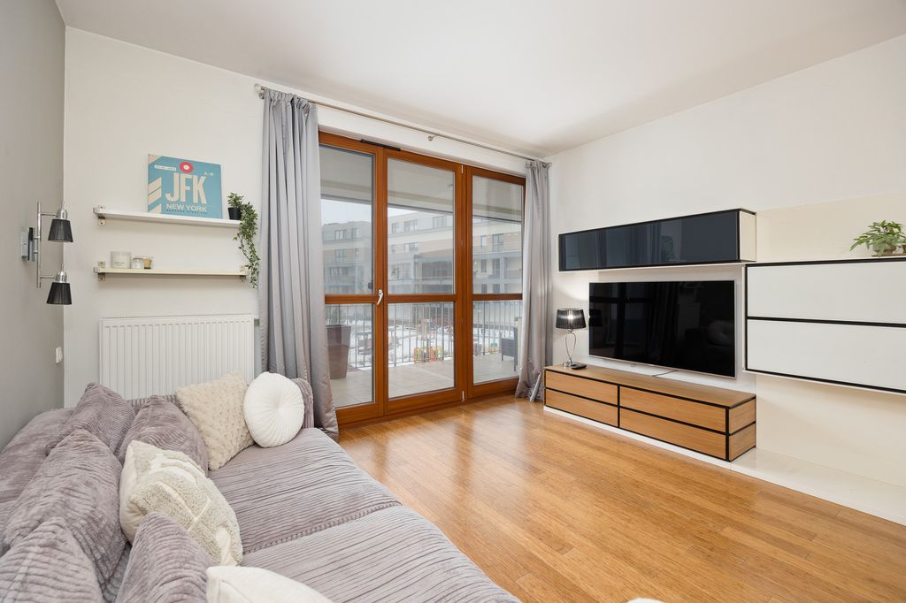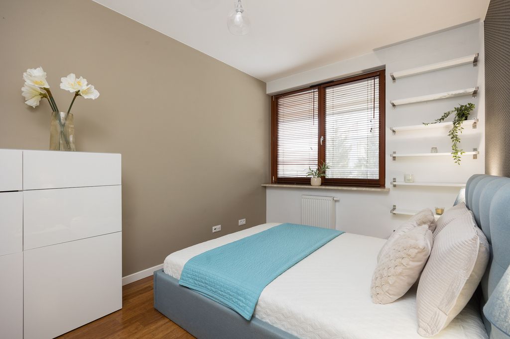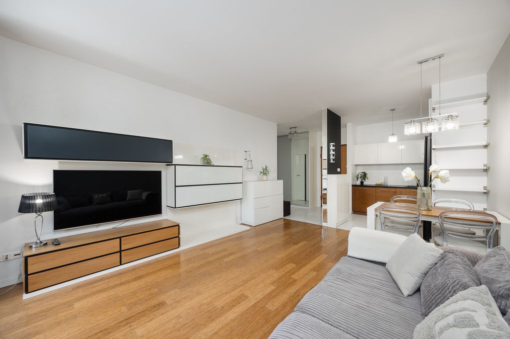W salonie i sypialni zastosowano deskę podłogową, natomiast w kuchni, korytarzu i łazience gres. Kuchnia w pełnej zabudowie z kompletem sprzętów AGD, w tym zmywarka oraz pralko-suszarka.