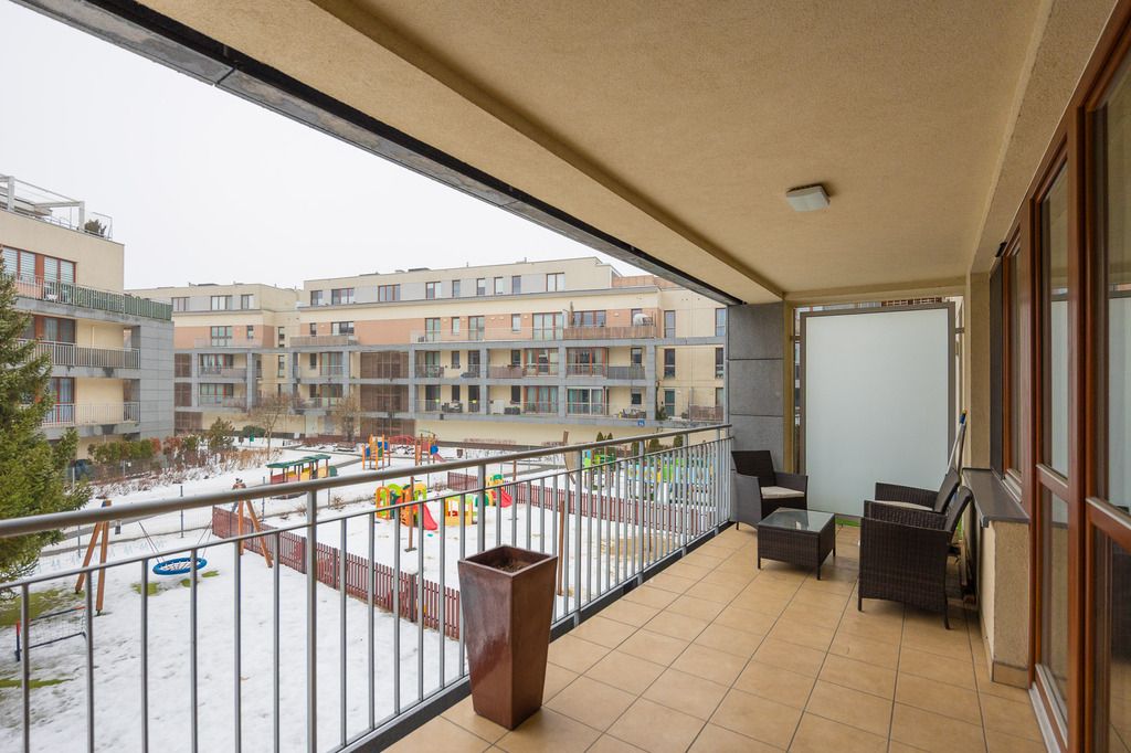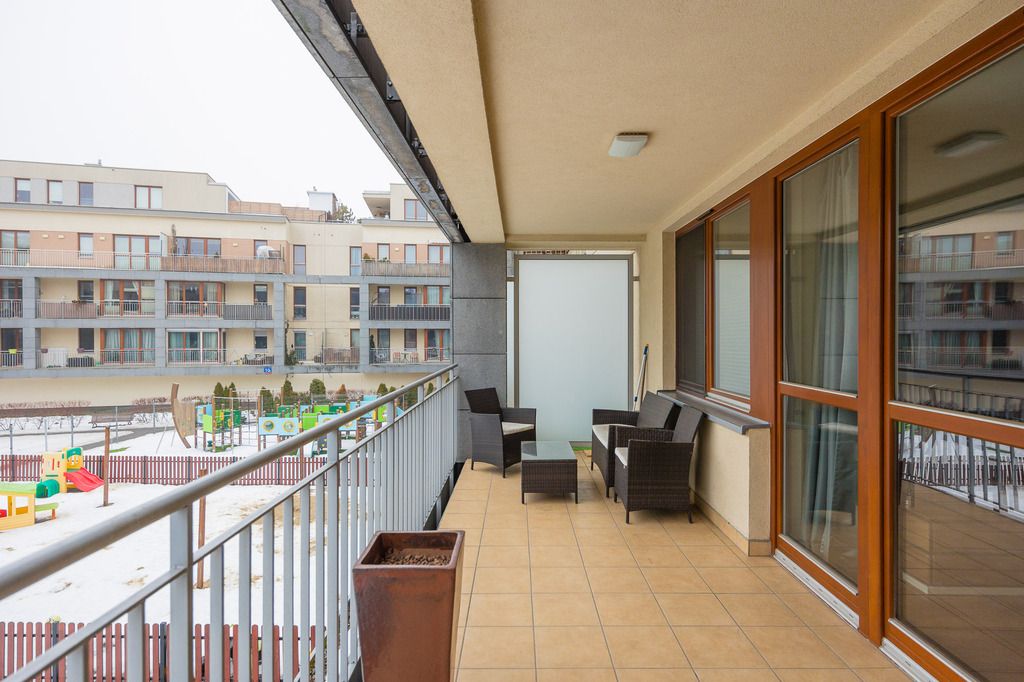 Duże, panoramiczne okna prowadzą na przestronny balkon o powierzchni ok. 16 m², stanowiący naturalne przedłużenie części dziennej.