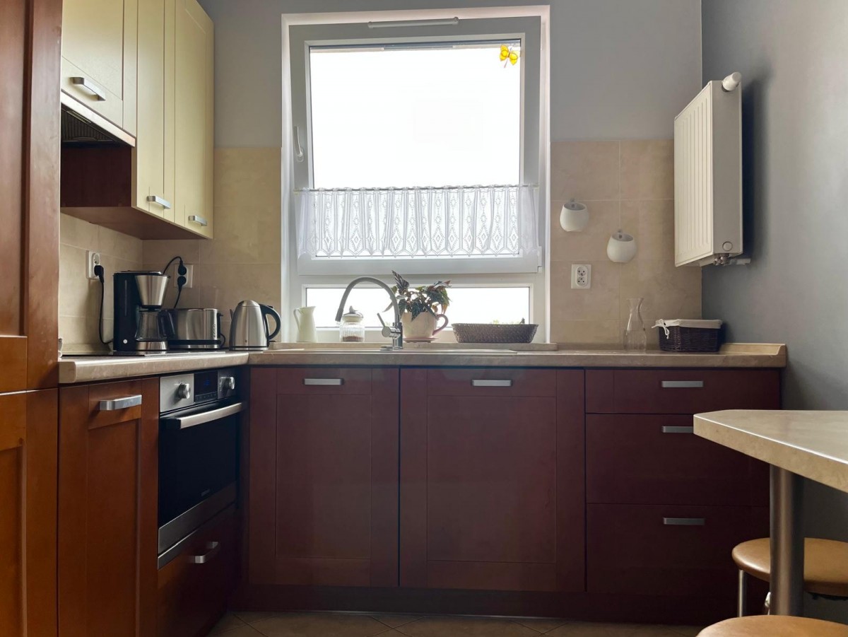 Kuchnia wyposażona w szafki  w zabudowie ze zmywarką, piekarnikiem z funkcją mikrofalówki i kuchenką indukcyjną.