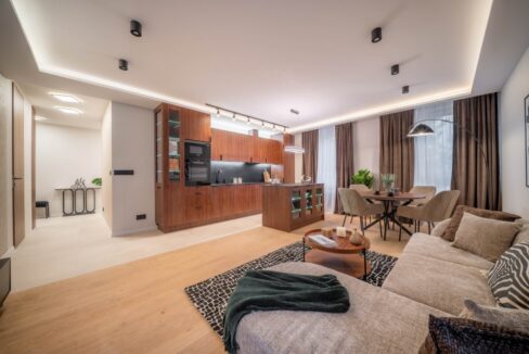 Kompletne umeblowane. W większym pokoju znajdują się liczne szafy, kanapa, fotele, komoda, duży telewizor, stół i krzesła. W mniejszym łóżko, biurko, szafa i regały na książki.