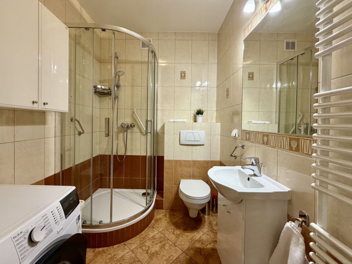 W łazience jest prysznic, pralka, WC i umywalka oraz liczne szafki na kosmetyki i środki czystości.