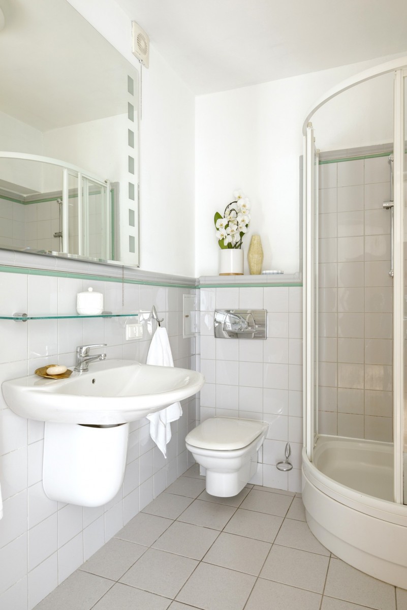 W łazience znajduje się prysznic, WC, umywalka i sporo miejsca na przechowywanie kosmetyków oraz środków czystości.
