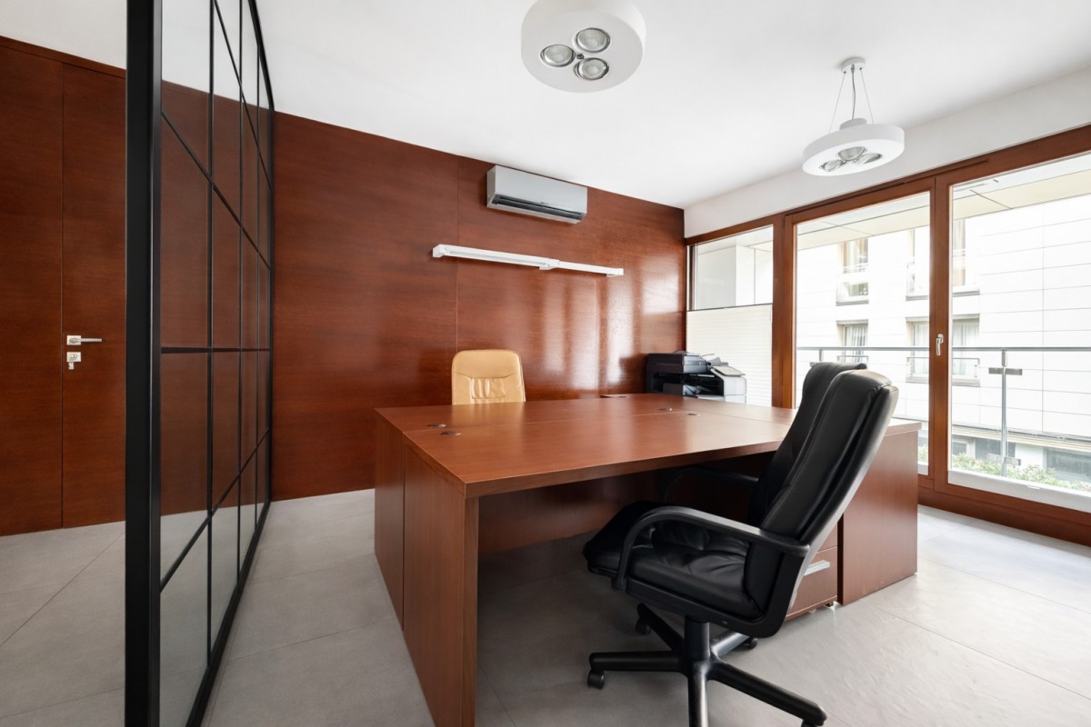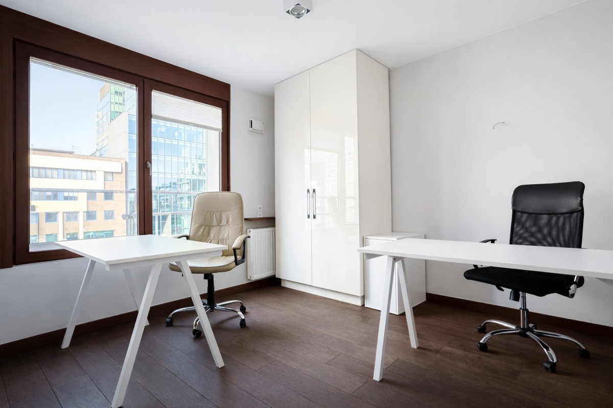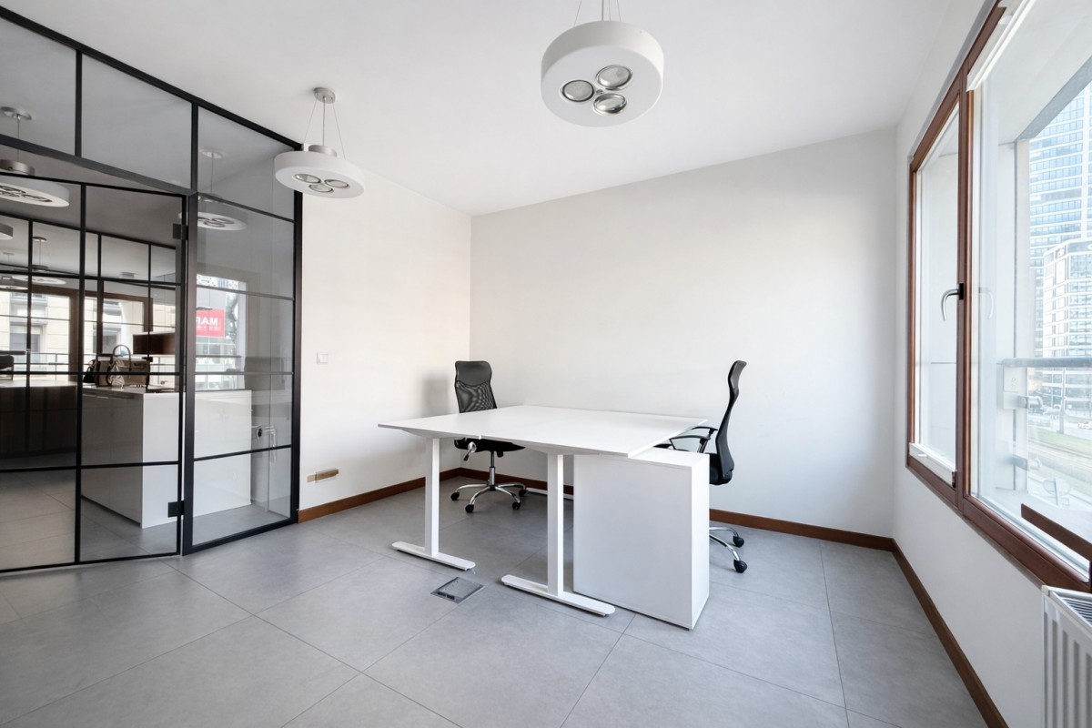 The premises with an area of approx. 96.5 m² are located on the 2nd floor of a modern residential and office building with a reception desk and 24-hour security. The property was originally designed as an apartment but has been adapted into a functional office space.