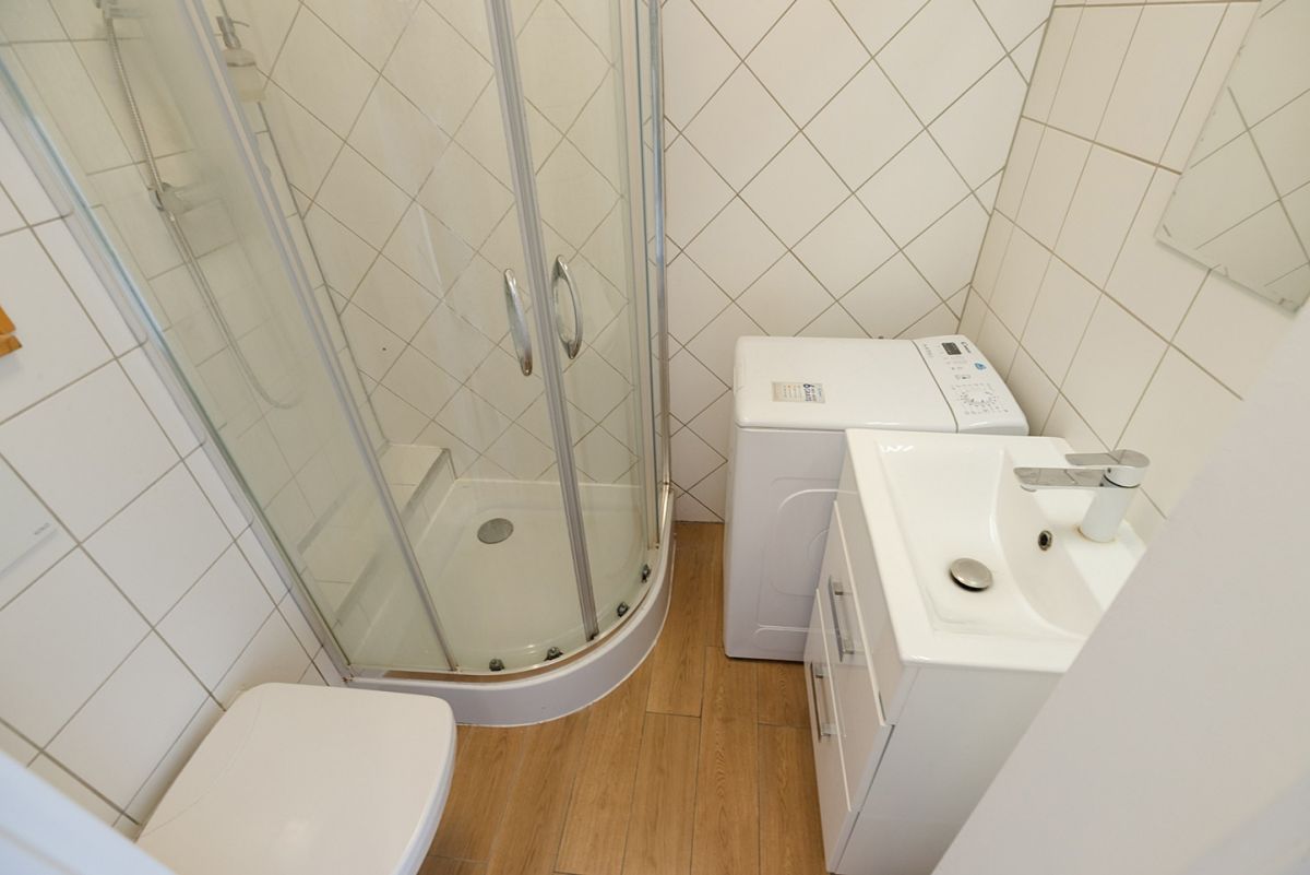 Mieszkanie o powierzchni 23 m² składa się z pokoju z wyposażonym aneksem kuchennym oraz w pełni funkcjonalnej małej łazienki (2,3 m²). Okna wychodzą na pięknie utrzymany wewnętrzny ogród.