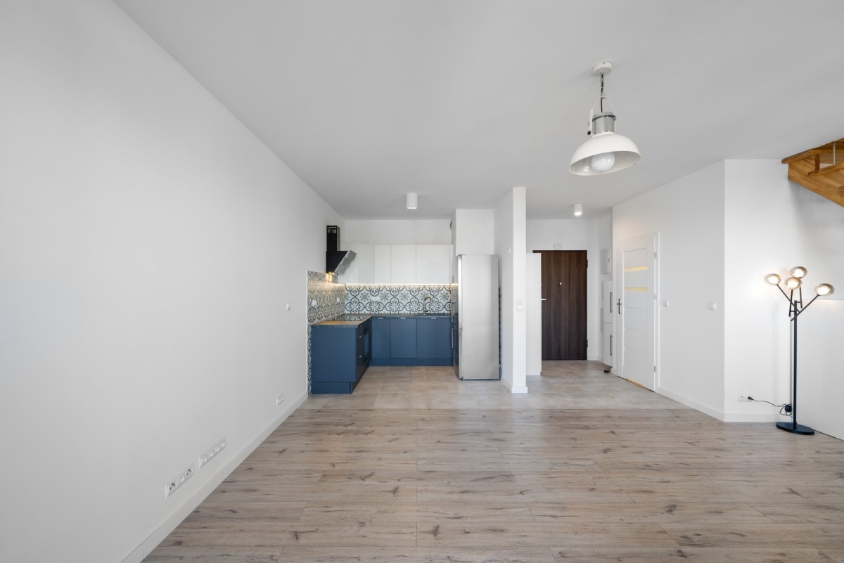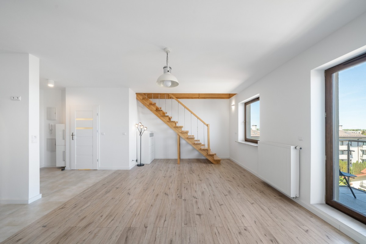 For rent: bright and quiet two-level apartment in a building from 2019, located in the gated „Faktoria” estate at 270 Poznańska Street in Ożarów Mazowiecki, only 25 minutes from the center of Warsaw. The apartment can be rented furnished or unfurnished.