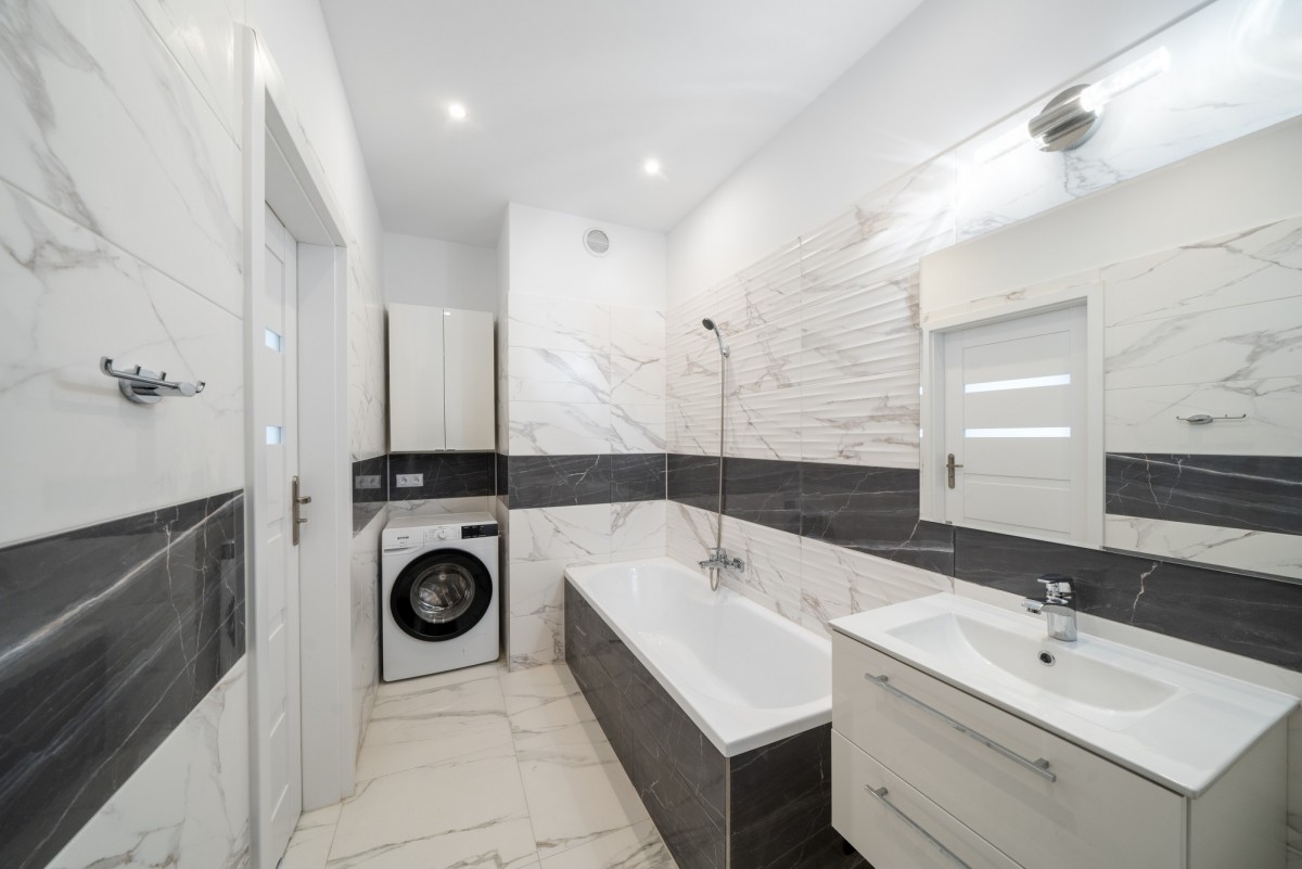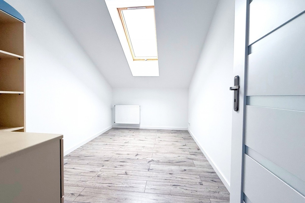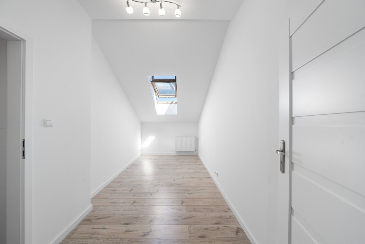 Despite its central location in Ożarów, the apartment is very quiet. The two-level layout allows for a comfortable separation of day and night zones. The kitchen is fully equipped (dishwasher, fridge, hood, induction cooktop, oven – all by Gorenje), as are both bathrooms (one with a bathtub and washing machine, the other with a shower). The hallway and walk-in closet feature wardrobes. The remaining rooms can be furnished by the owner.