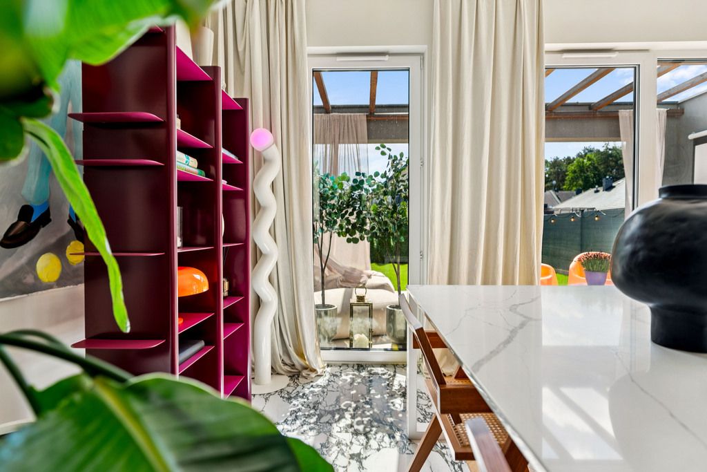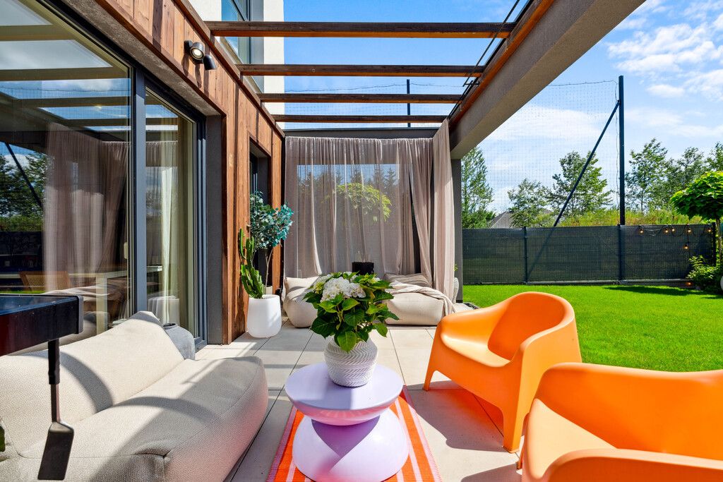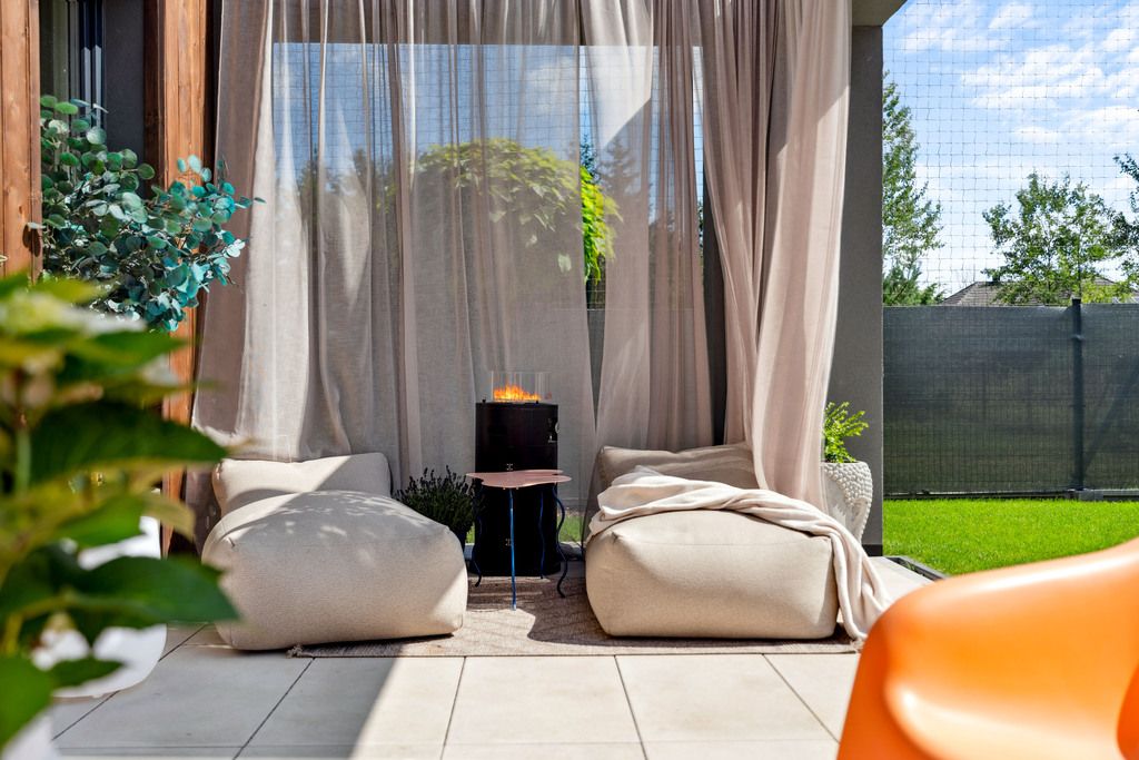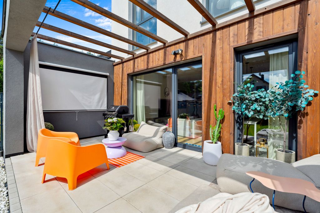 Przestrzeń dzienna została idealnie doświetlona dzięki ekspozycji wschodnio-południowej. Z salonu wychodzimy na przestronny, zagospodarowany taras w stylu hiszpańskim – z płytami betonowymi, strefą wypoczynkową, zewnętrznym rzutnikiem, strefą grillowania, zasłonami boho i designerskimi meblami ogrodowymi. To idealne miejsce do relaksu i spotkań.