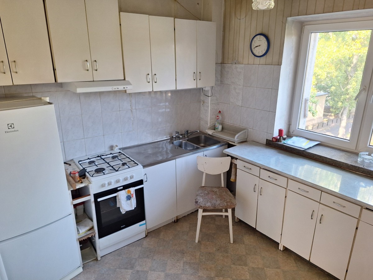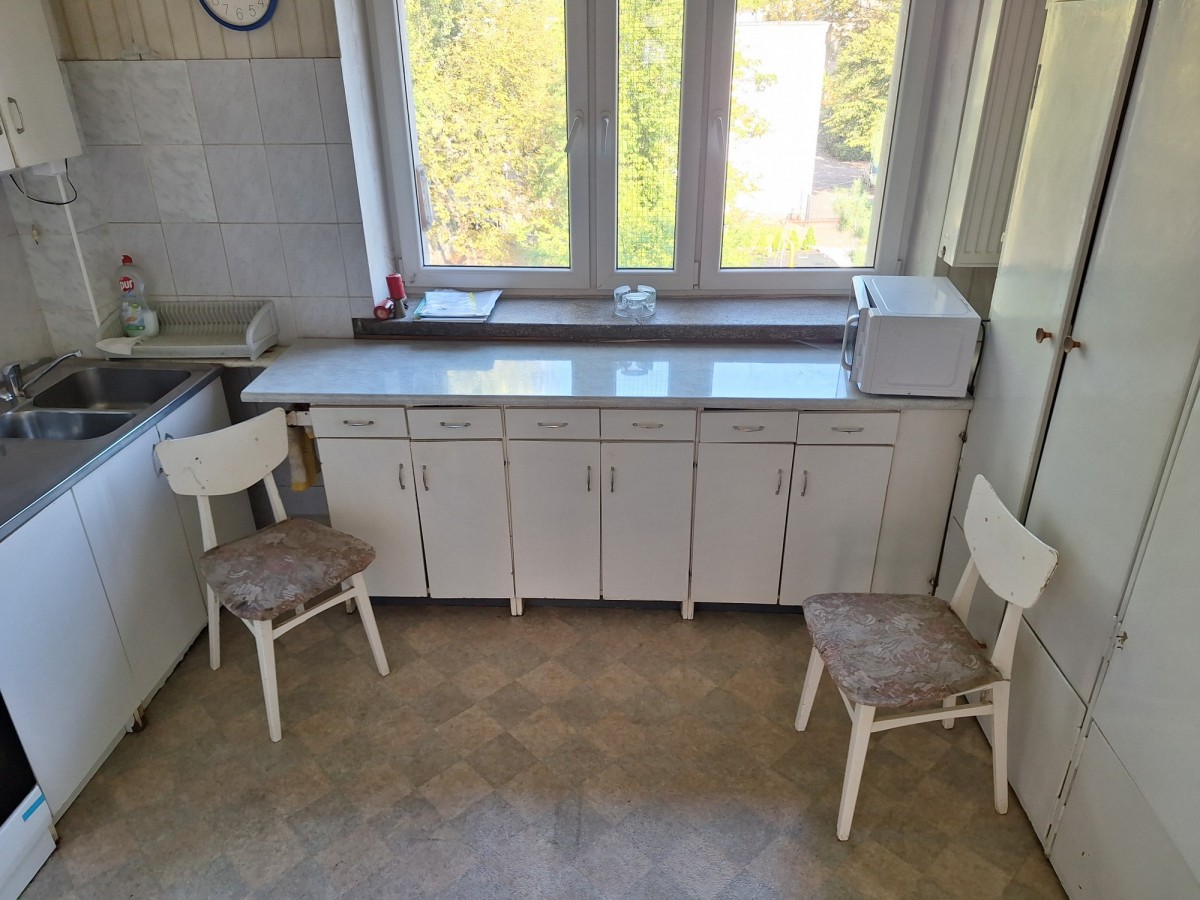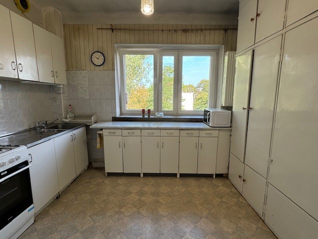 Kuchnia spora z własnym dużym oknem skierowanym na podwórko.