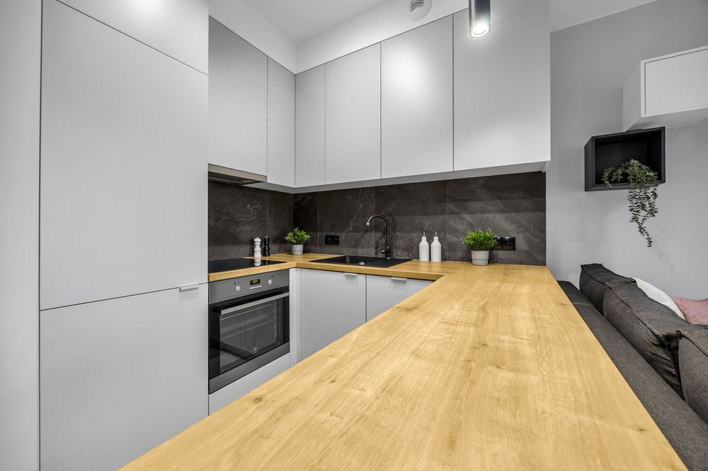Kuchnia nie udaje, że jej nie ma – jest pełnoprawna, wygodna i zaprojektowana tak, by naprawdę się w niej gotowało, a nie tylko podgrzewało kawę. Zabudowy meblowe wykorzystują każdy centymetr przestrzeni, oferując zaskakująco dużo miejsca do przechowywania. Wysokiej klasy materiały, solidne wykończenie i spójna estetyka sprawiają, że od progu czuć jakość – tę prawdziwą, nie katalogową.