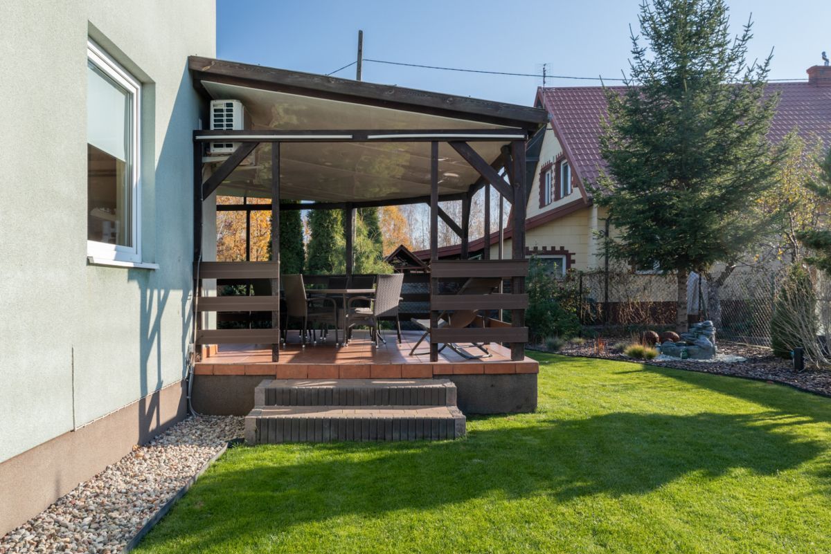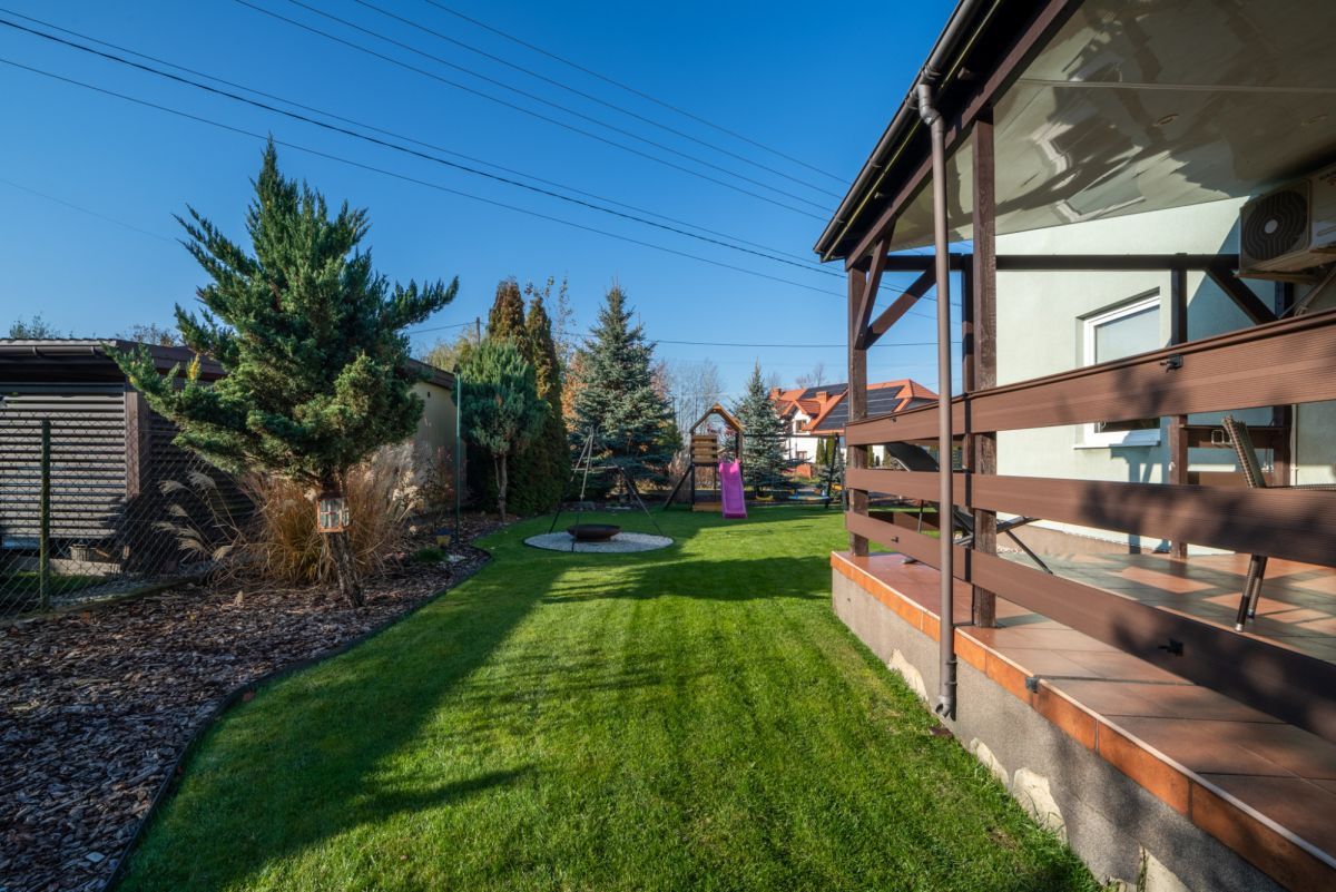 Wyjątkowym atutem tej nieruchomości jest przestronny, piękny ogród – idealnie zadbany trawnik, miejsce na ognisko, a także zadaszony taras z grillem, doskonały do spędzania czasu niezależnie od pogody. W tej przestrzeni można znaleźć prywatność, spokój i ciszę.