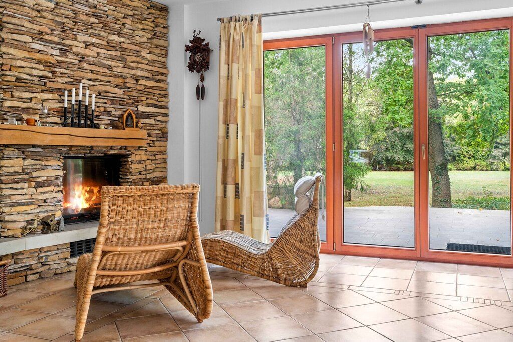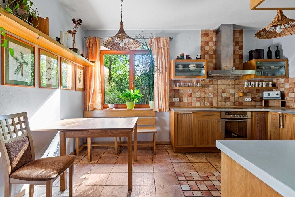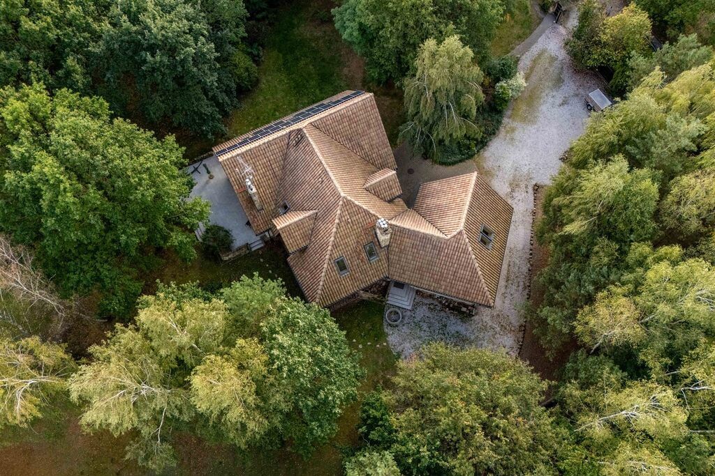 Dom murowany z dachem z dachówki śródziemnomorskiej i rynnami miedzianymi. Z salonu wyjście na duży taras z piaskowca. Na dachu instalacja fotowoltaiczna 6,6 kW rozliczana na starych zasadach