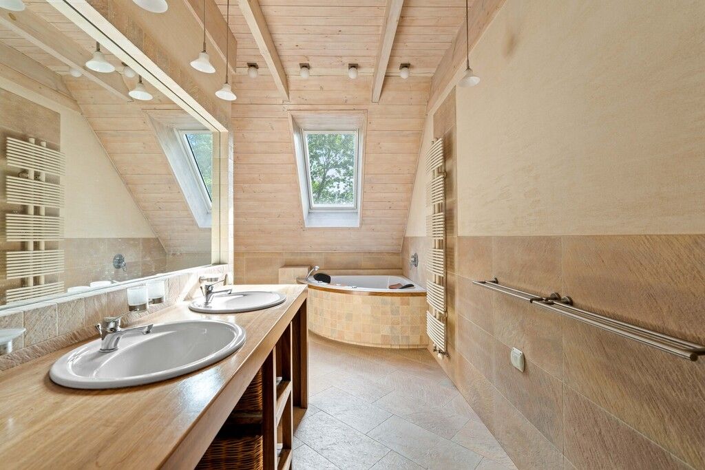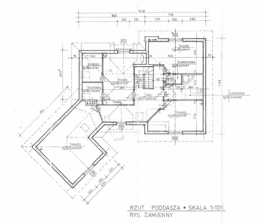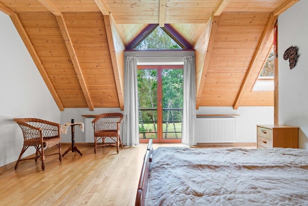 Na parterze kuchnia salon z kominkiem dwa pokoje garderoba łazienka toaleta i kotłownia. Na piętrze sypialnia z łazienką i garderobą dwa pokoje dodatkowa łazienka i bawialnia. Ponad piętrem duży strych użytkowy