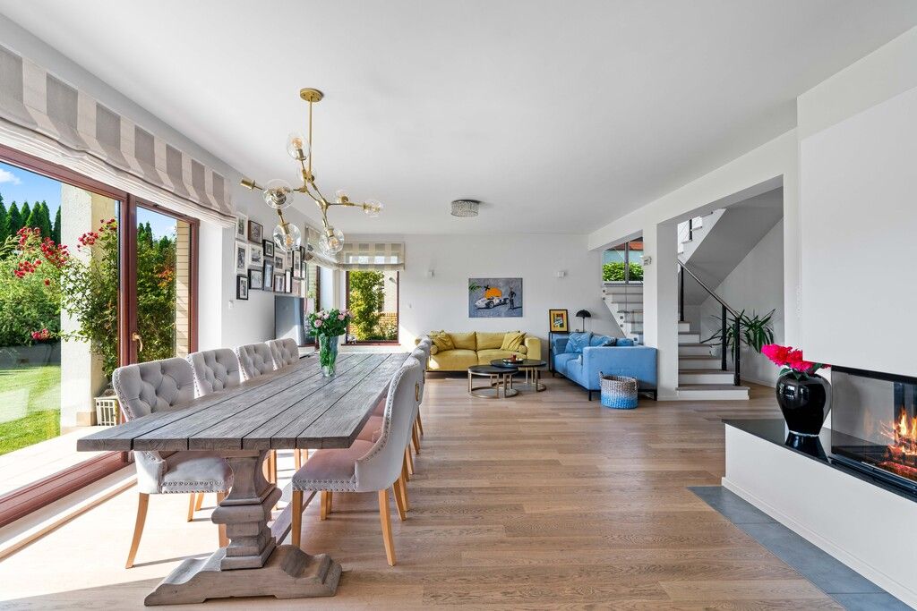 – przestronny salon z kominkiem połączony z jadalnią i kuchnią
