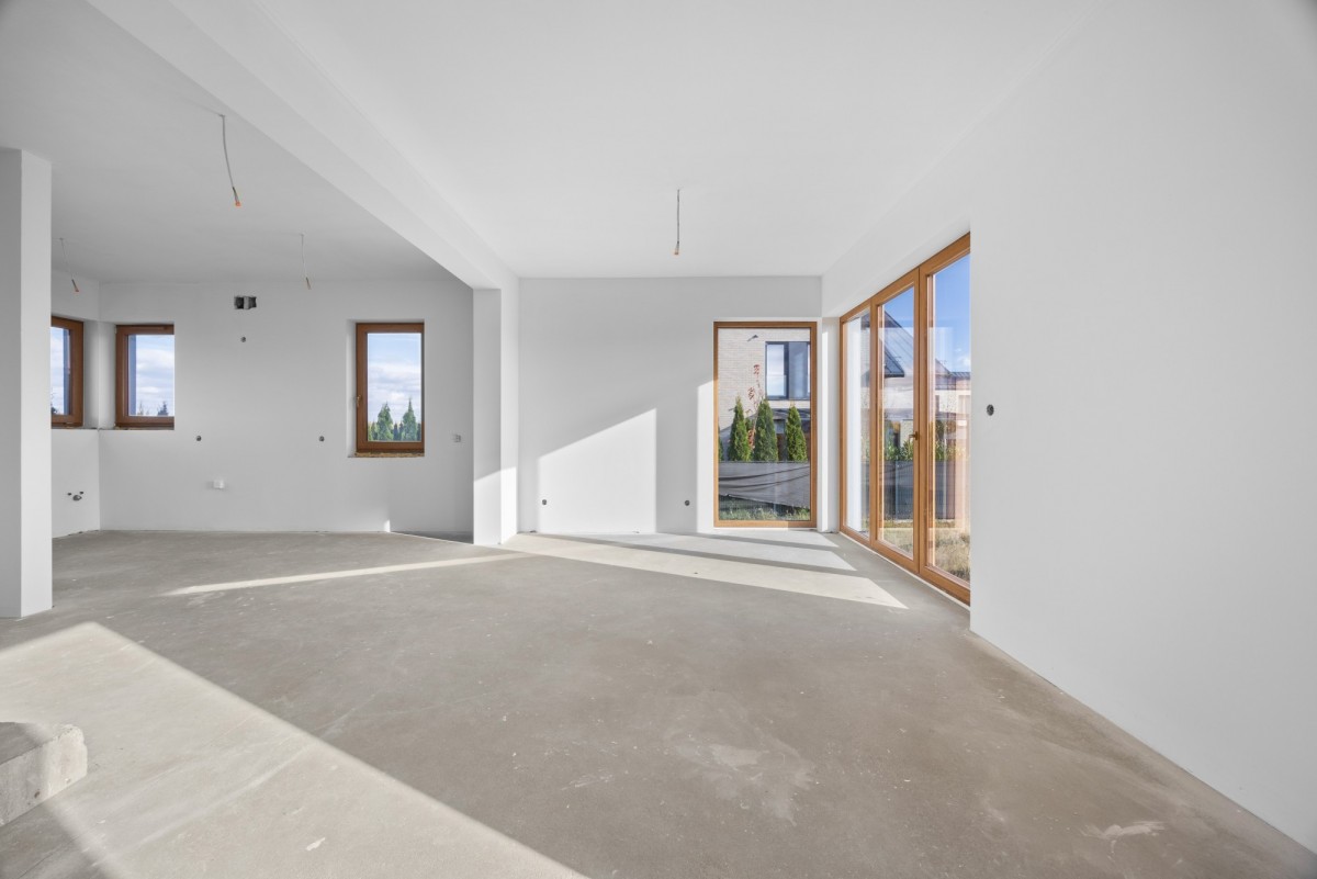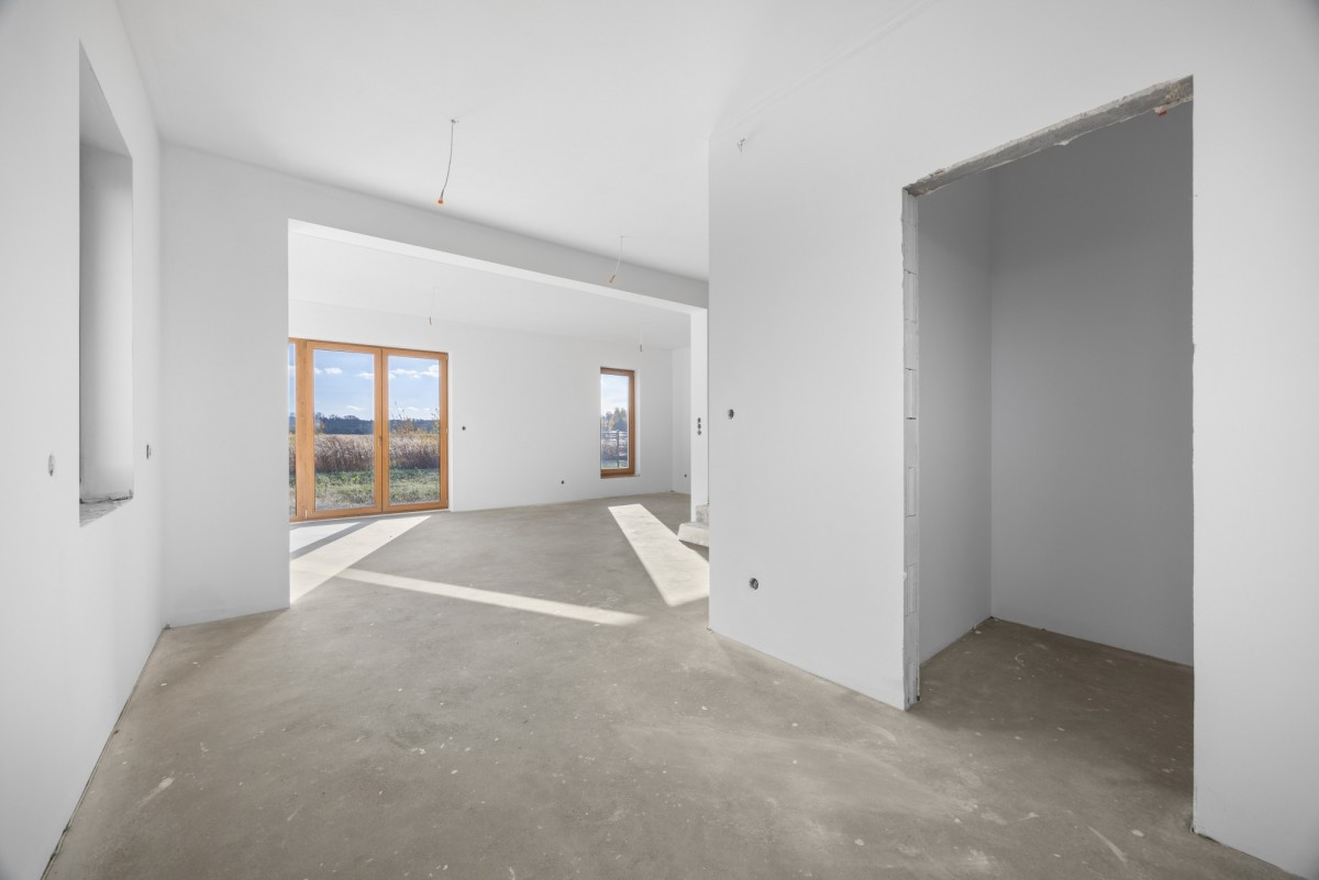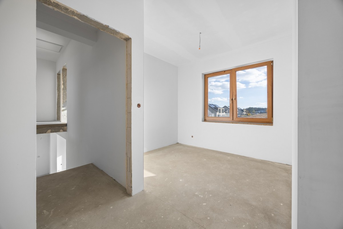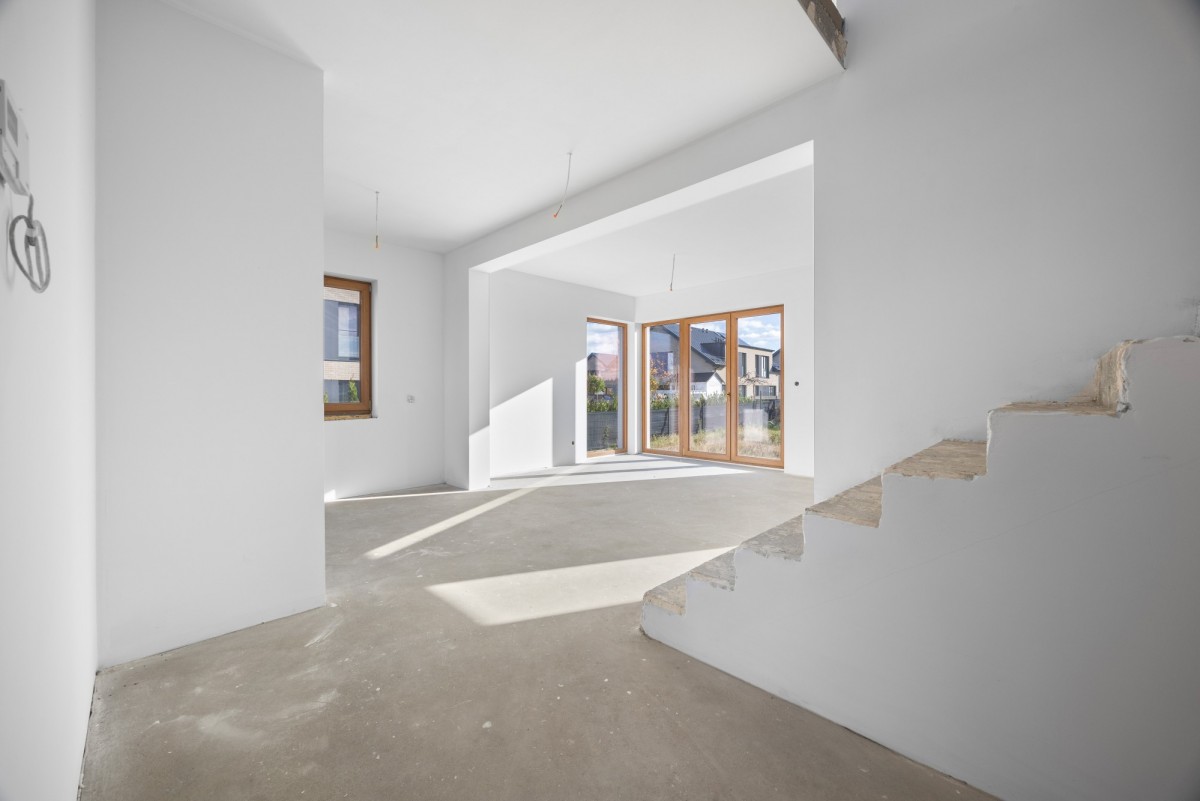 • Parter: salon z jadalnią i wyjściem na ogród, kuchnia, łazienka, pomieszczenie gospodarcze, wiatrołap, garaż.