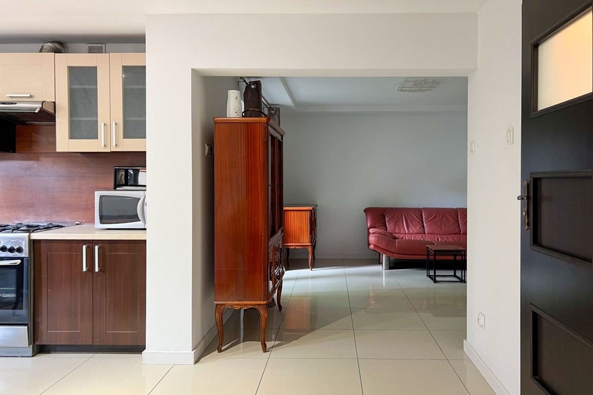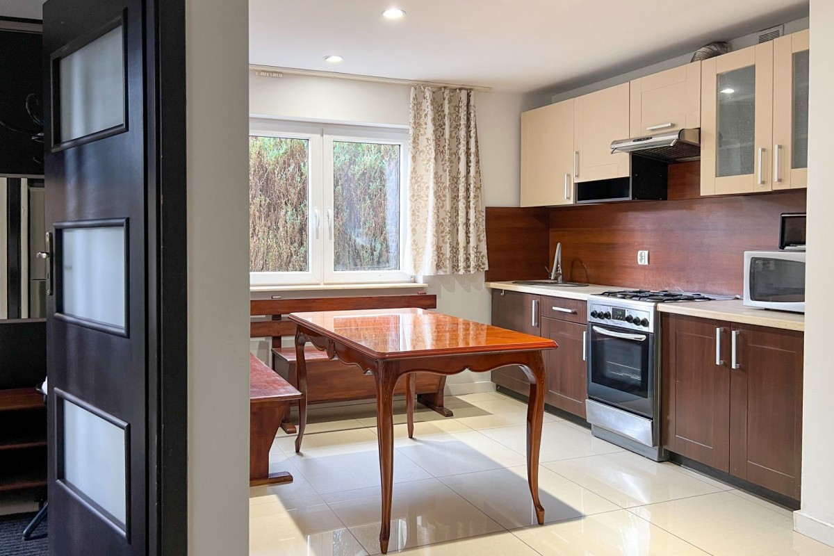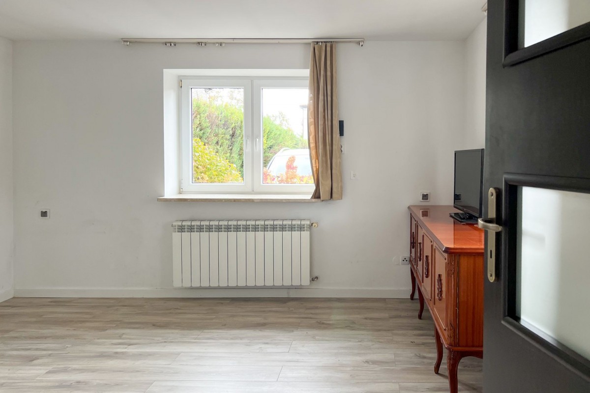 Dom jest przytulny, dobrze przemyślany i gotowy do zamieszkania. Składa się z salonu z wyjściem na taras i do ogrodu, otwartej, jasnej kuchni, przestronnej sypialni oraz łazienki. Jest też dodatkowy pokój z osobnym wejściem od ogrodu – obecnie pełni funkcję pomieszczenia gospodarczego, ale można go łatwo przerobić na drugą sypialnię lub biuro.