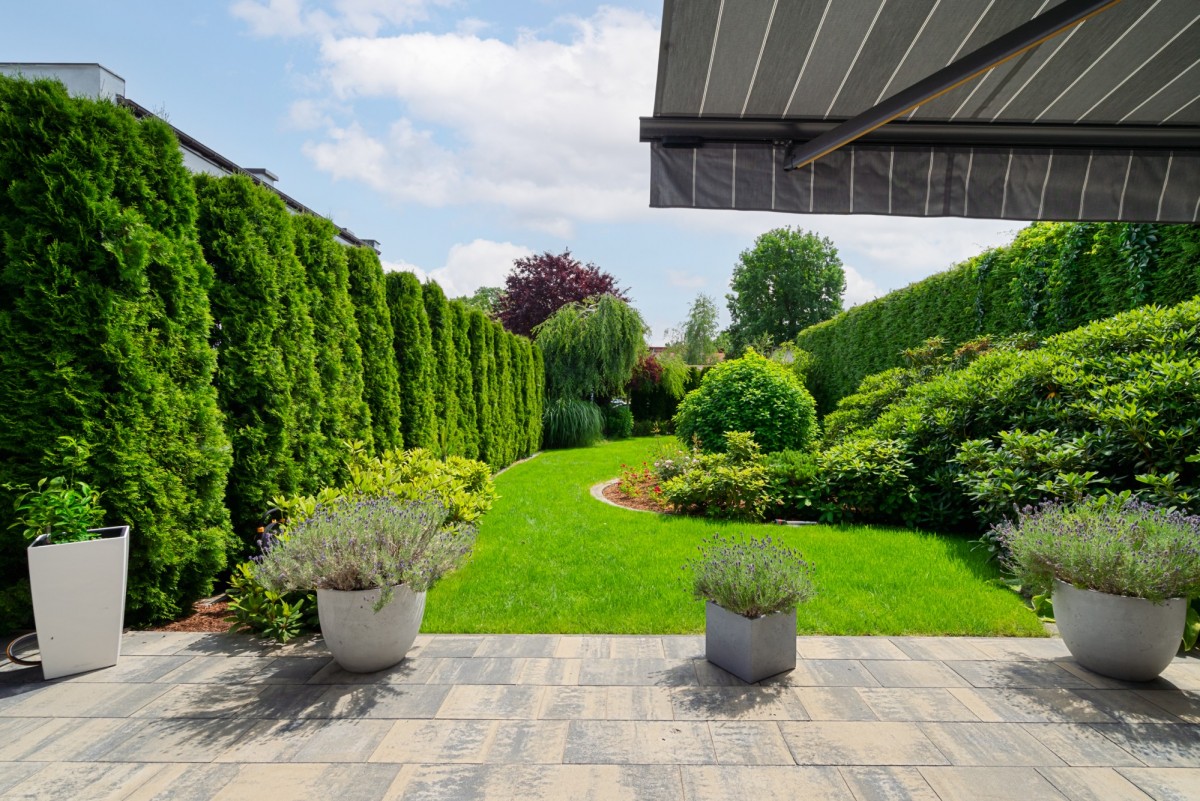 Zadbany ogród, oddzielony żywopłotem od części usługowej – gwarantuje prywatność