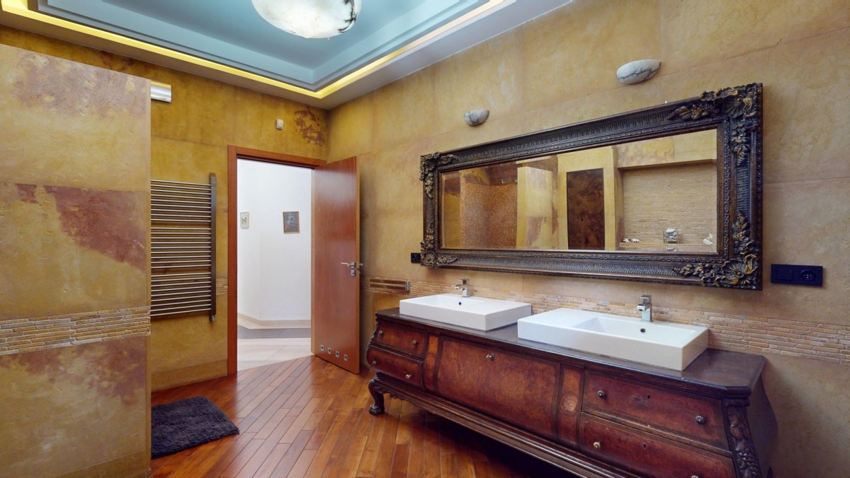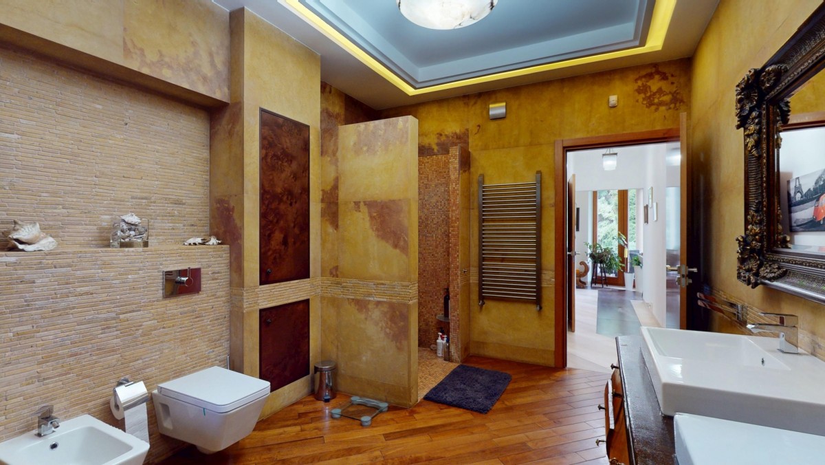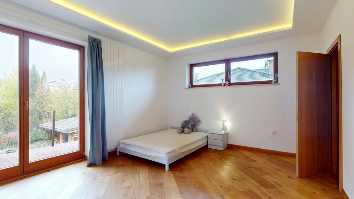 • piętro: salon z kuchnią i jadalnią, sypialnię z garderobą, gabinet, ogromny pokój z własną sypialnią i łazienką