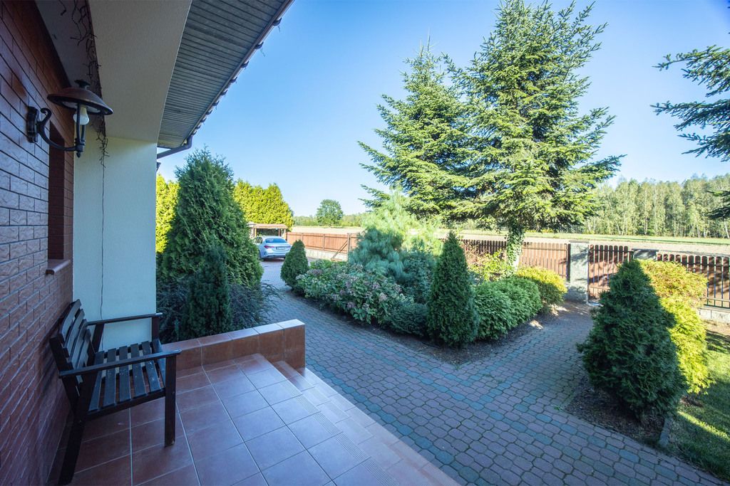 - Działka: 1180 m², pięknie zagospodarowana z nasadzeniami, drzewami i bujną roślinnością.