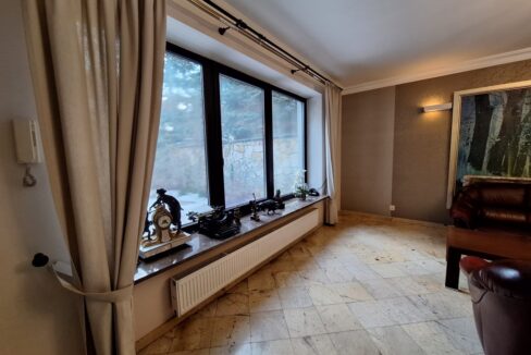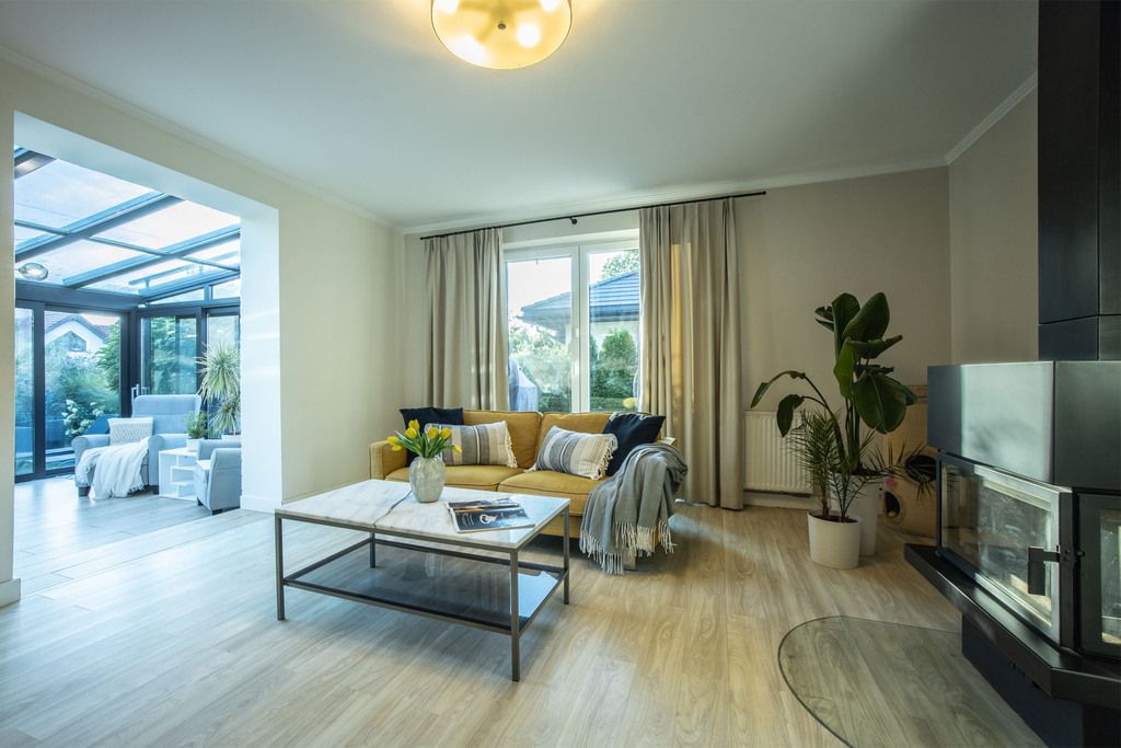 - Przestronny salon z kominkiem, połączony z pięknym ogrodem zimowym.