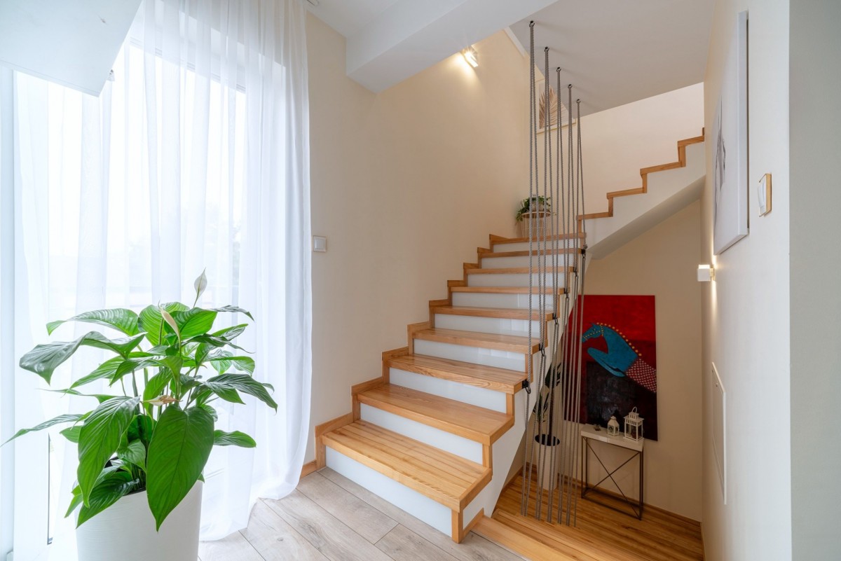 Charakterystyczna jasna elewacja z drewnianymi detalami doskonale komponuje się z zielenią otaczającą dom. Przy wejściu znajduje się stylowa pergola, która dodaje uroku oraz zapewnia praktyczne zadaszenie.
