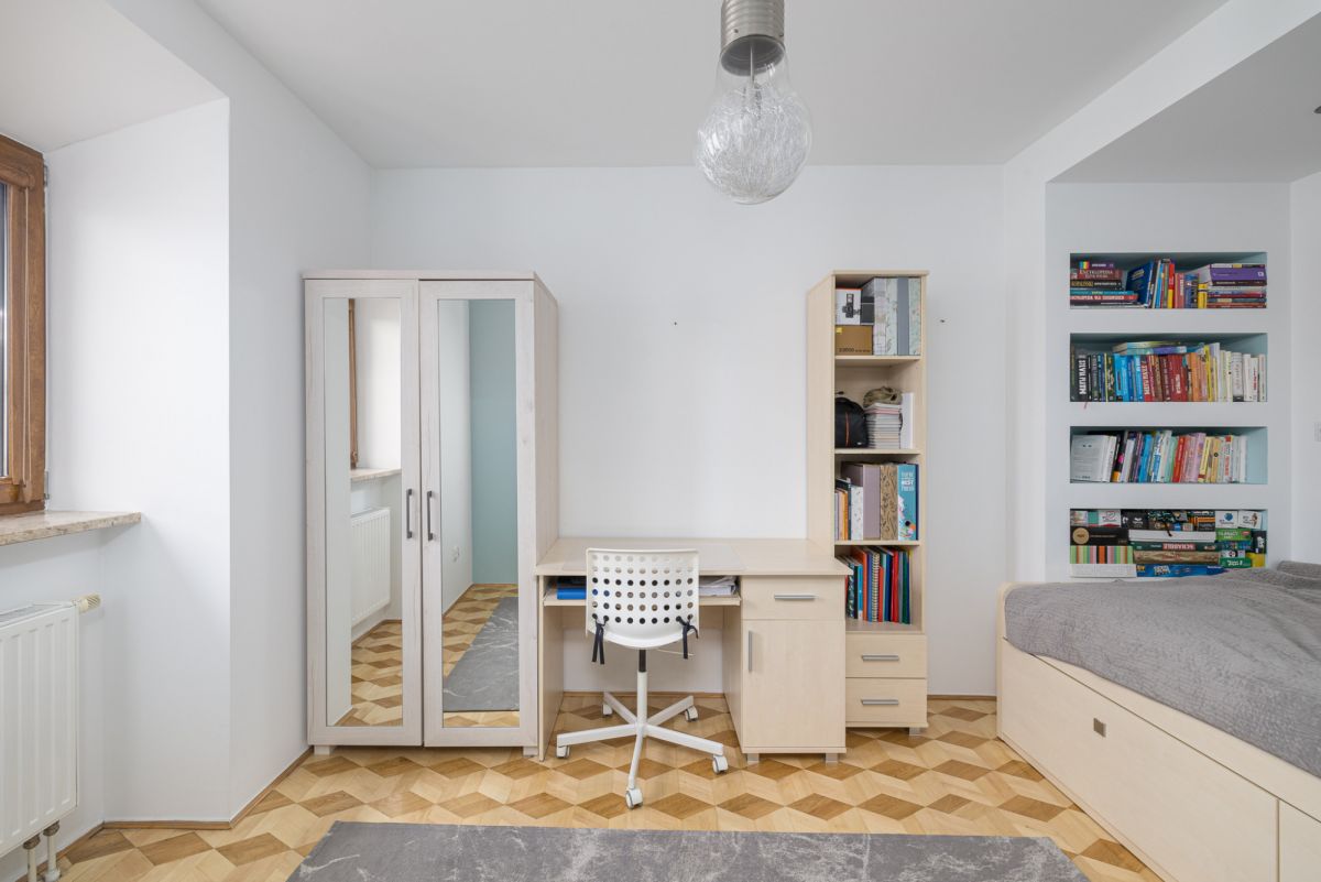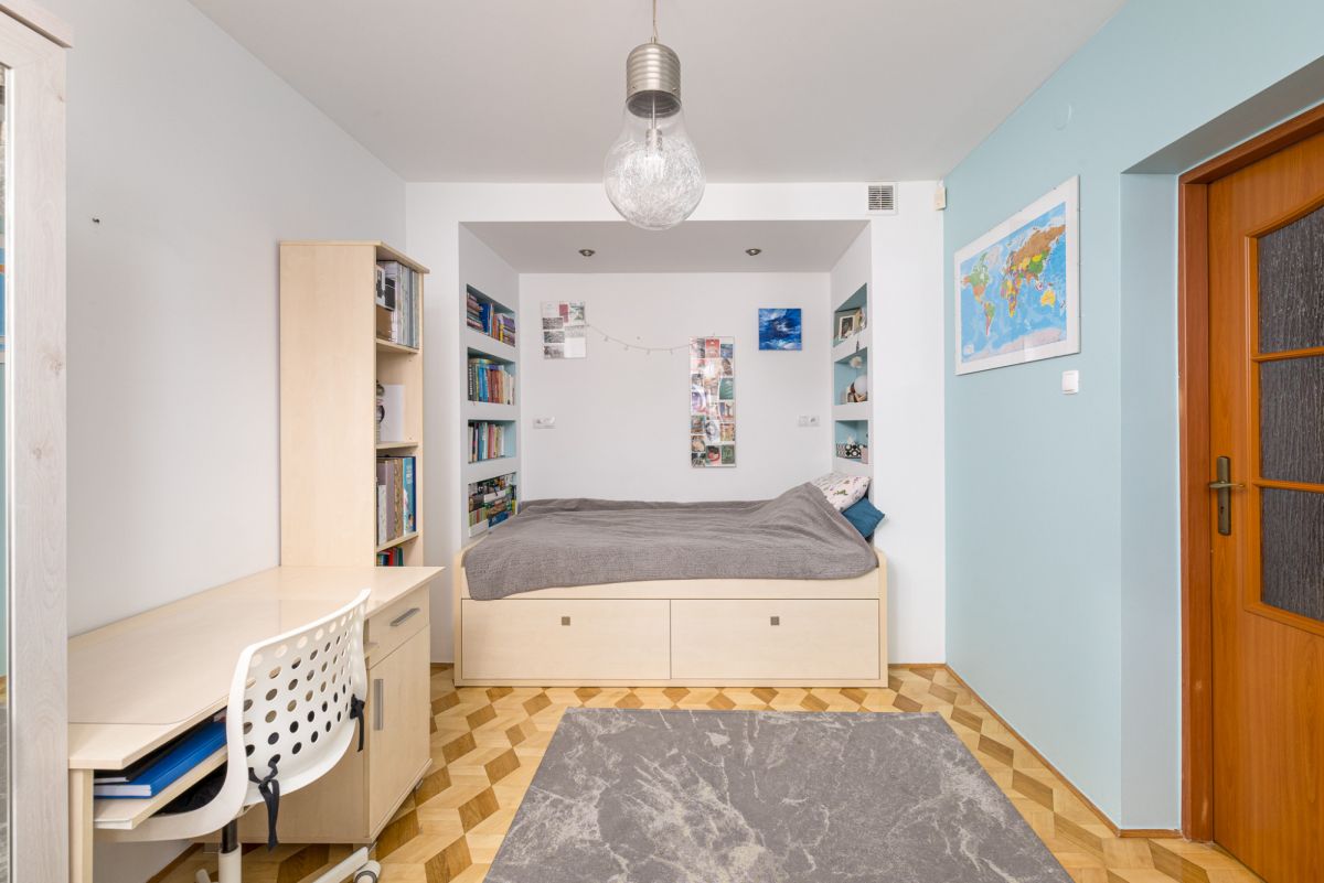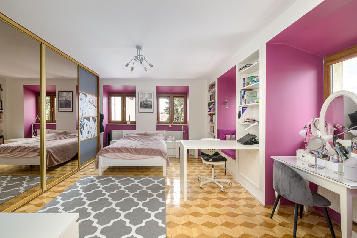 Na pierwszym piętrze znajdują się 2 oddzielne pokoje, łazienka(5,66 m2) oraz hol z klatką schodową (19,75 m2)