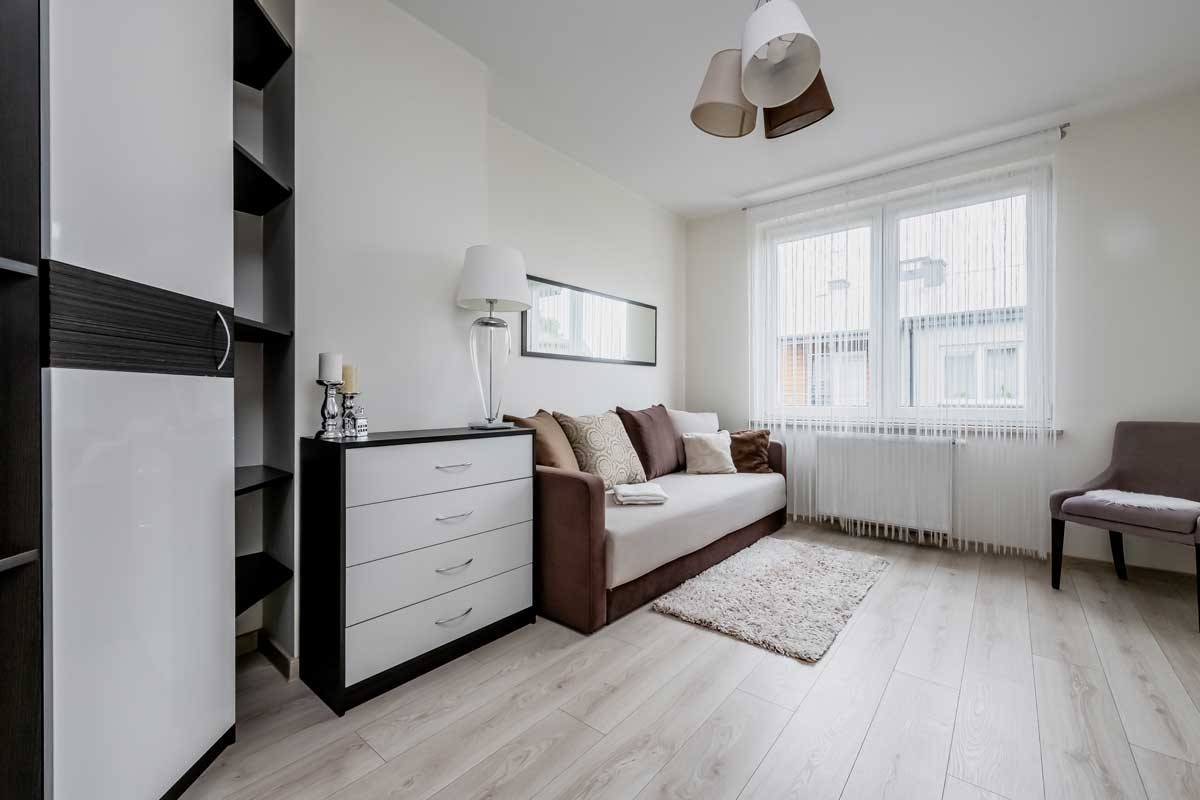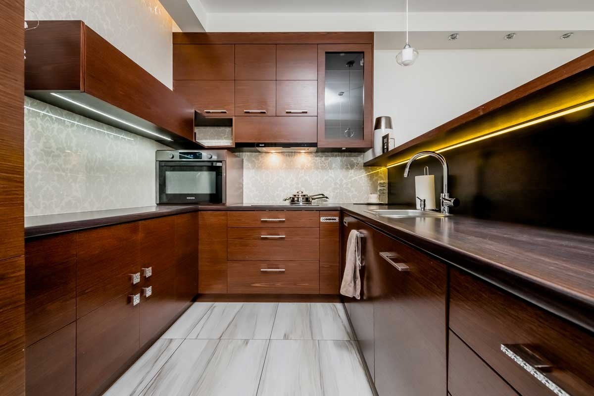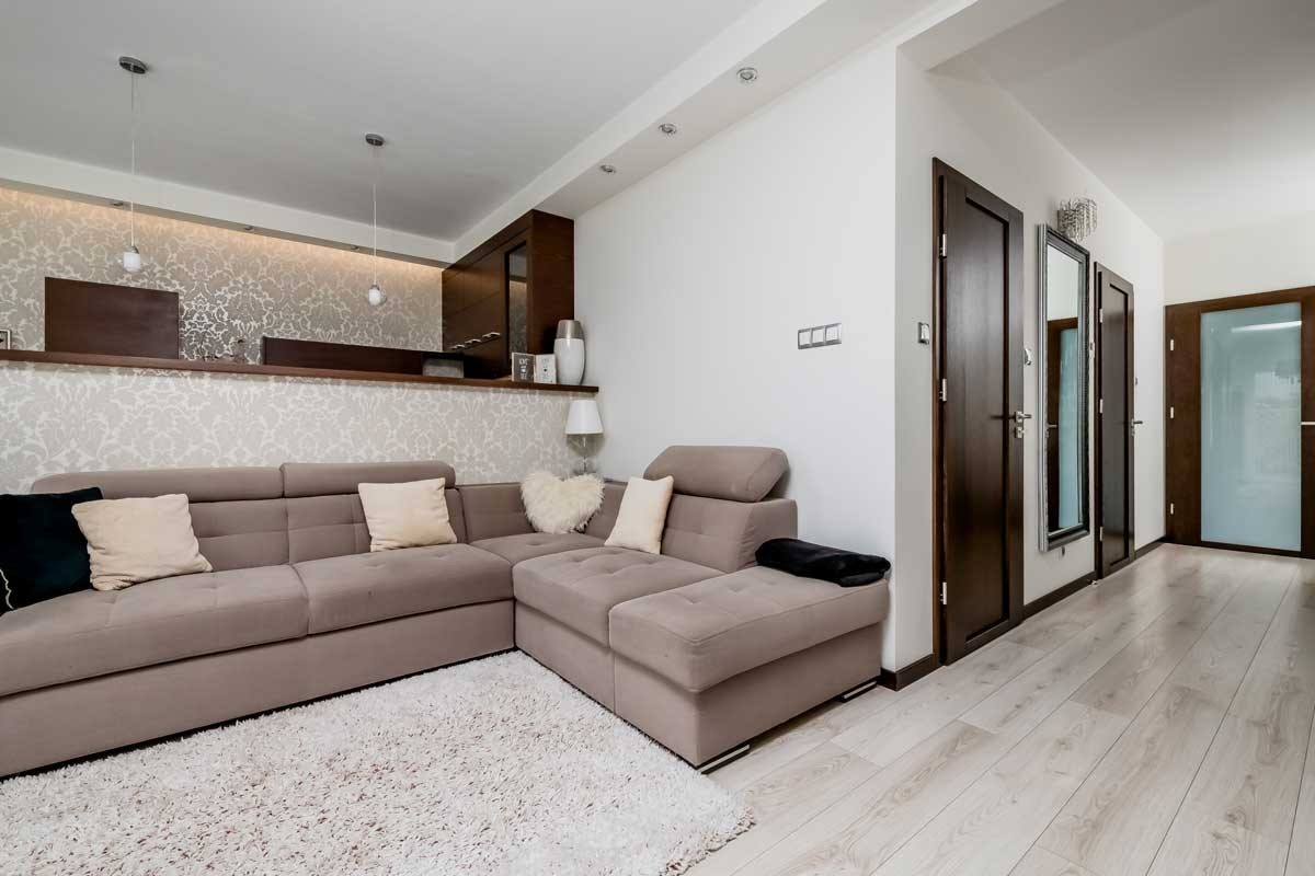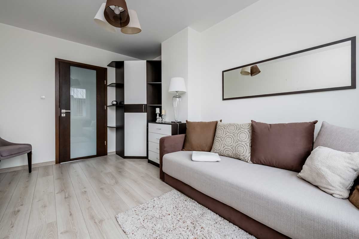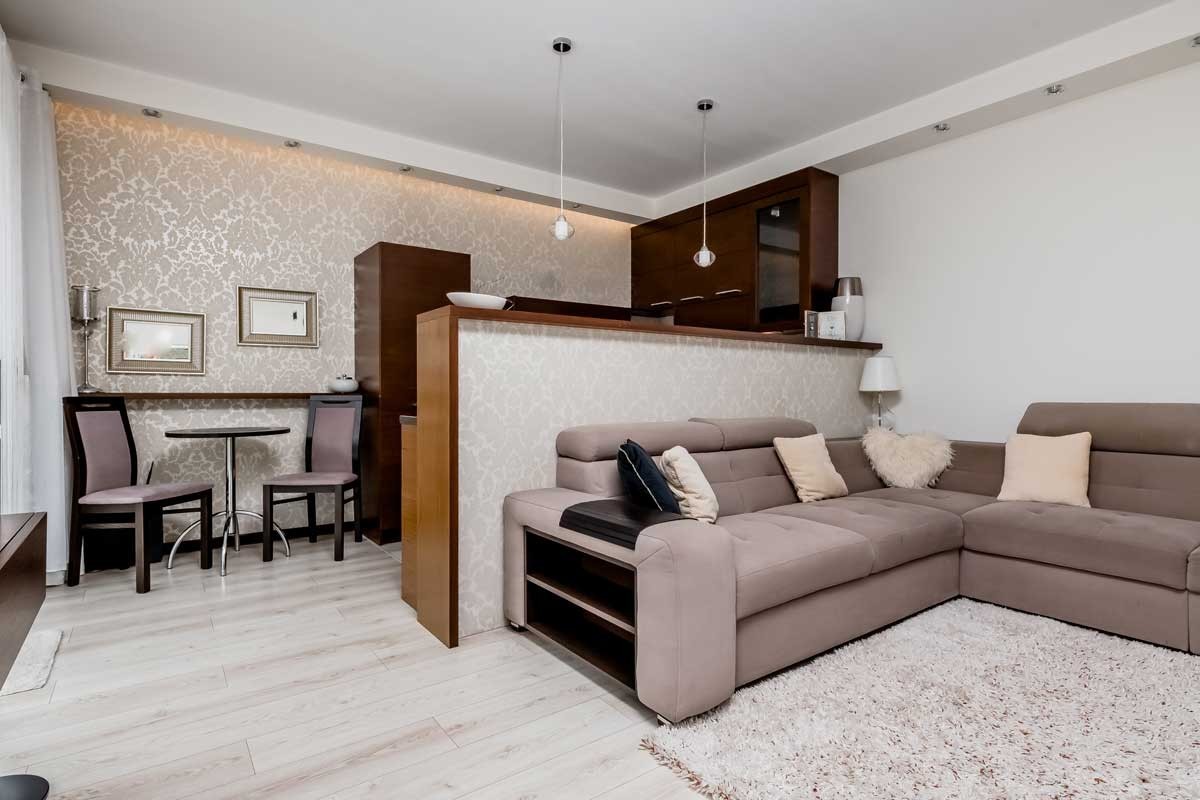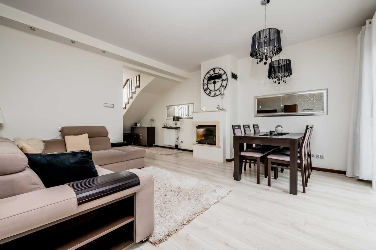 Aneks kuchenny wyposażony w sprzęt AGD w zabudowie: piekarnik z funkcją mikrofali, zmywarka, lodówko-zamrażarka, płyta indukcyjna. Meble kuchenne i salonowe fornirowane, wykonane na zamówienie. W salonie znajduje się narożnik, duży stół z sześcioma krzesłami. Z salonu wyjście na taras.