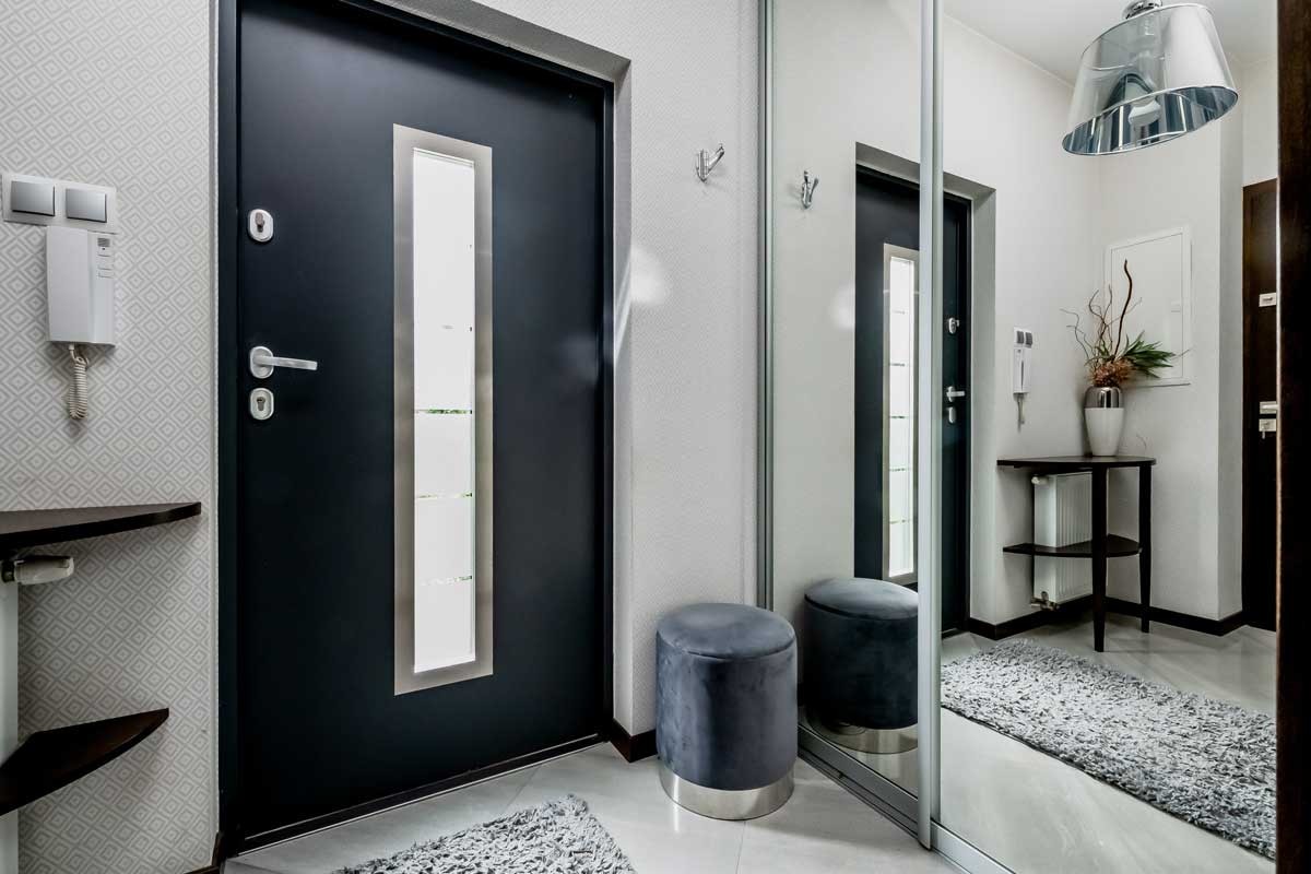Drzwi wejściowe drewniane, fornirowane. Okna PCV pięciokomorowe.
