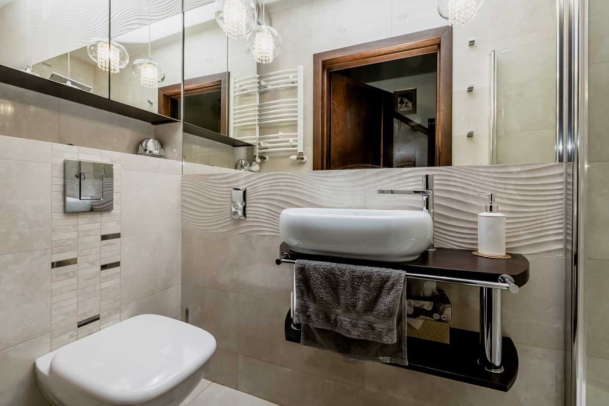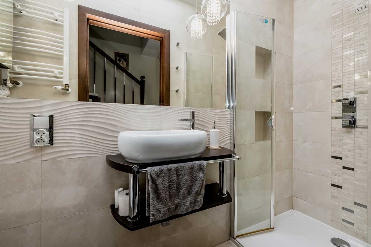 Łazienka z wanną, umywalką, sedesem i pralką. W drzwiach balkonowych i tarasowych oraz oknach zamontowano moskitiery i rolety wewnętrzne.