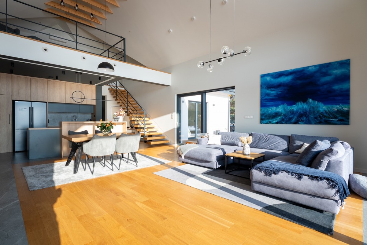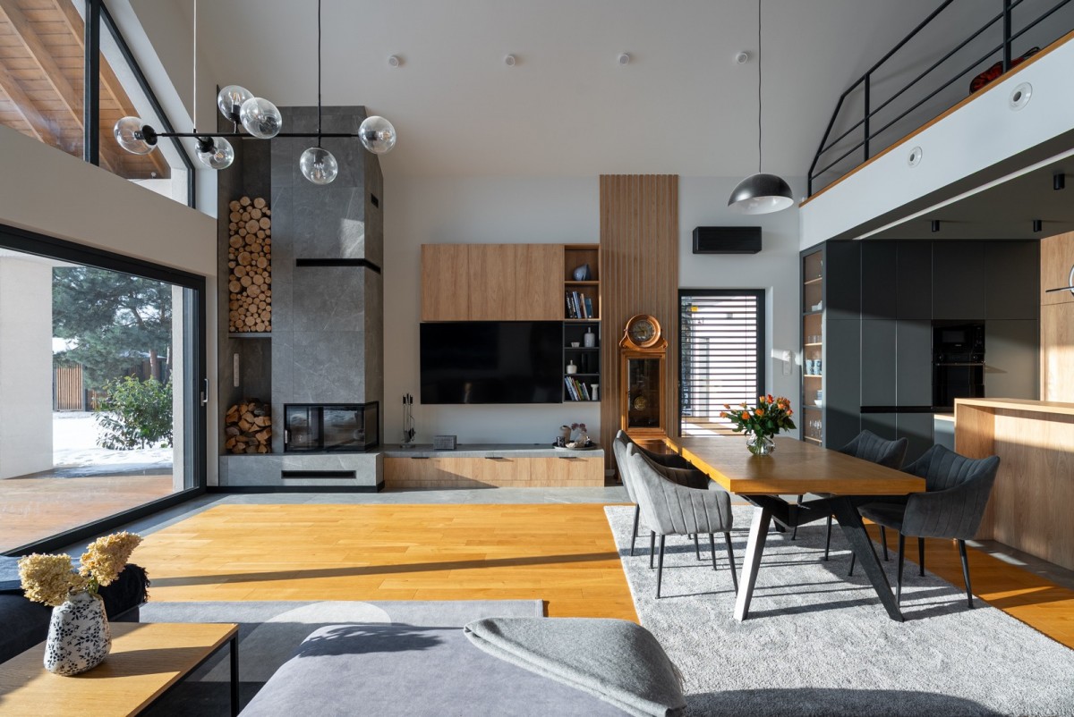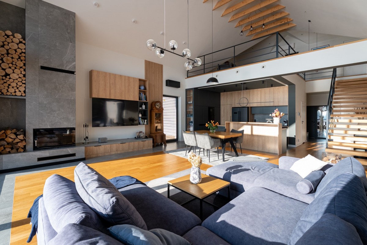 • przestronny salon z kuchnią, wysokość 7 m, z chłodziarką na wino i narożnym kominkiem – serce domu, doskonale doświetlone dzięki dużym przeszkleniom typu HS