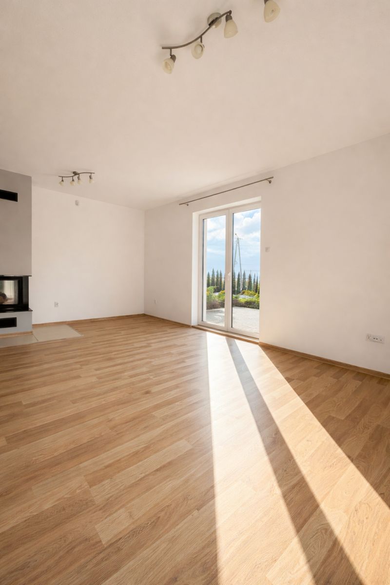 Wnętrze domu jest dobrze doświetlone, a bezpośrednie wyjście z salonu na ogród pozwala wygodnie korzystać z przestrzeni na zewnątrz.