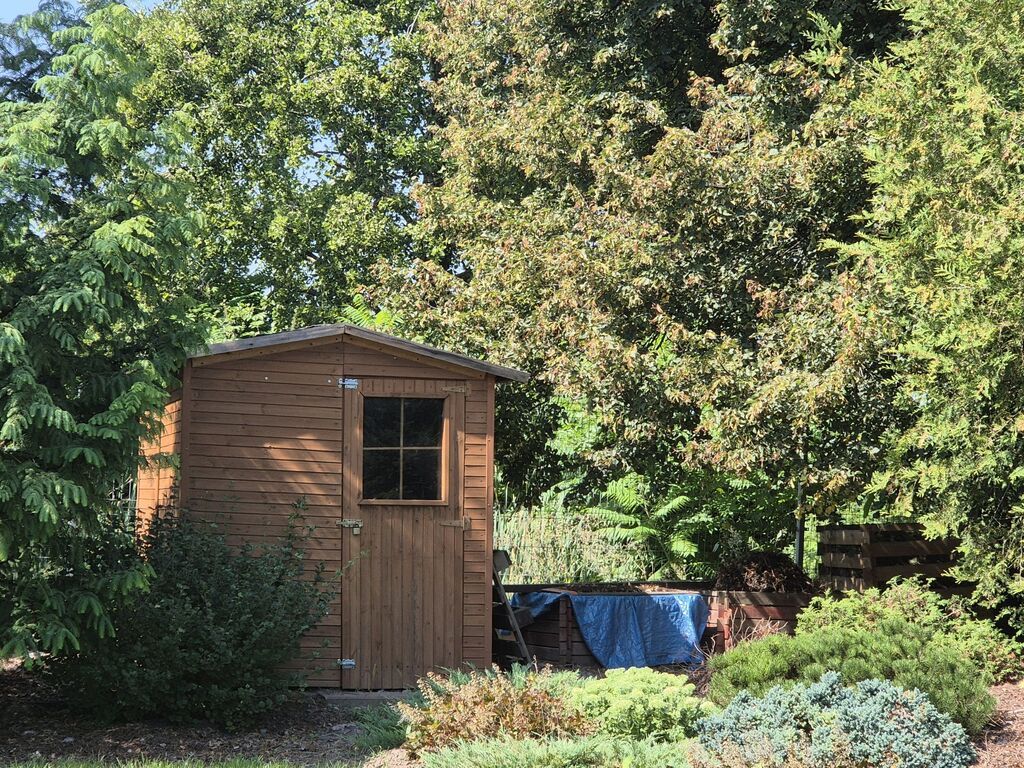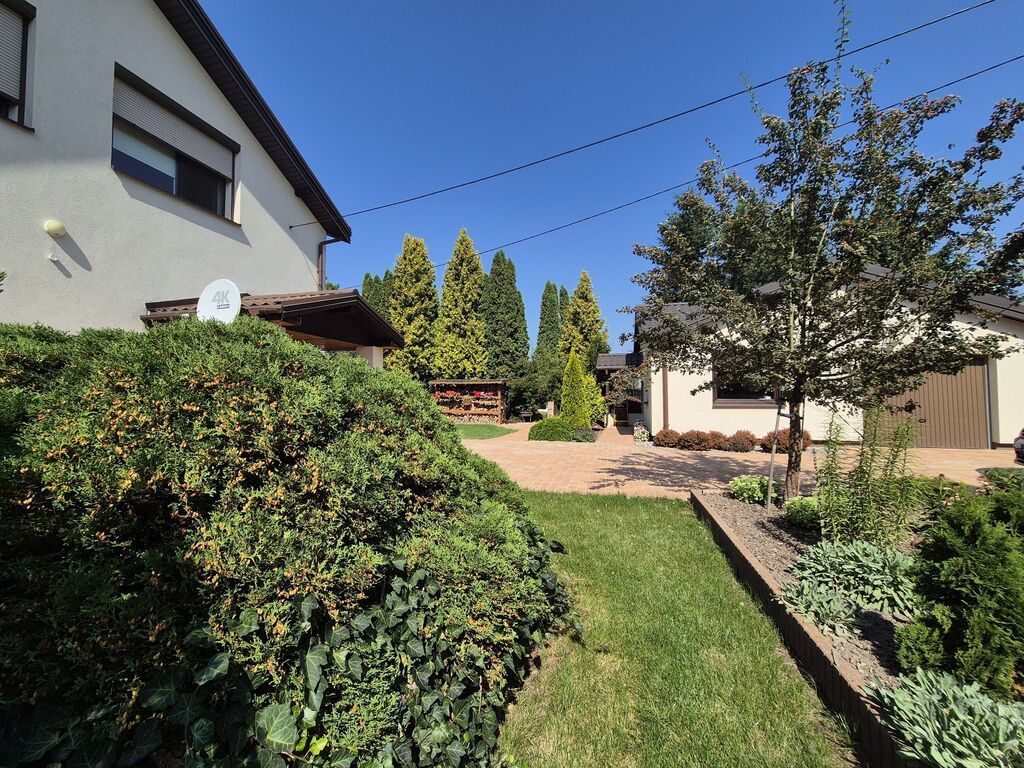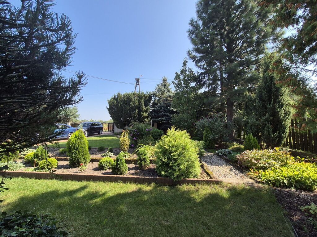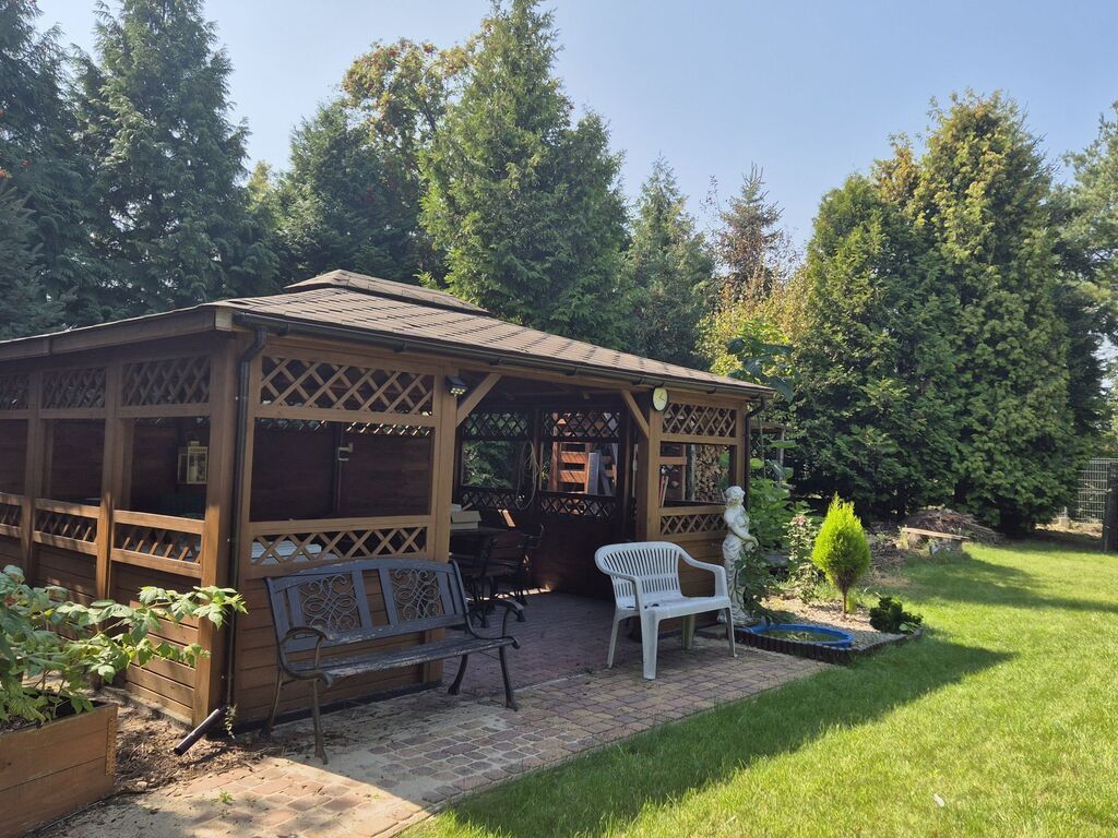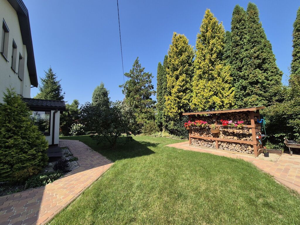 W ogrodzie ponad 150 nasadzeń i kwiatów, zadaszenie na drewno do kominka oraz drewniana altana pokryta dachówka bitumiczną.,
