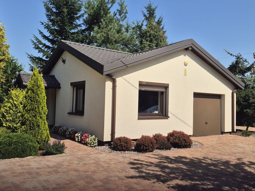 Tynk zewnętrzny silikonowy, stolarka okienna PCV z roletami antywłamaniowymi z aluminium , dach pokryty blachodachówką.