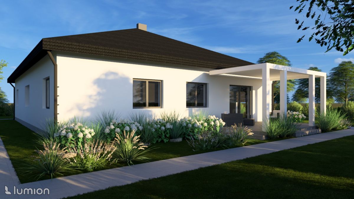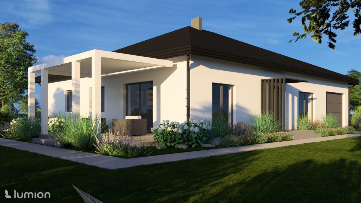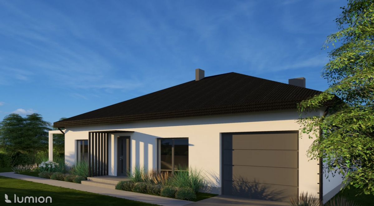 Projekt powstał z myślą o wygodzie i komforcie w codziennym użytkowaniu. Część dzienna oraz prywatna tworzą funkcjonalny układ dla rodziny 2+1 lub 2+2. Z salonu mamy wyjście na duży taras, z którego rozpościera się widok na ścianę lasu. Dom powstaje w otoczeniu zabudowy jednorodzinnej, prowadzi do niego utwardzona droga.
