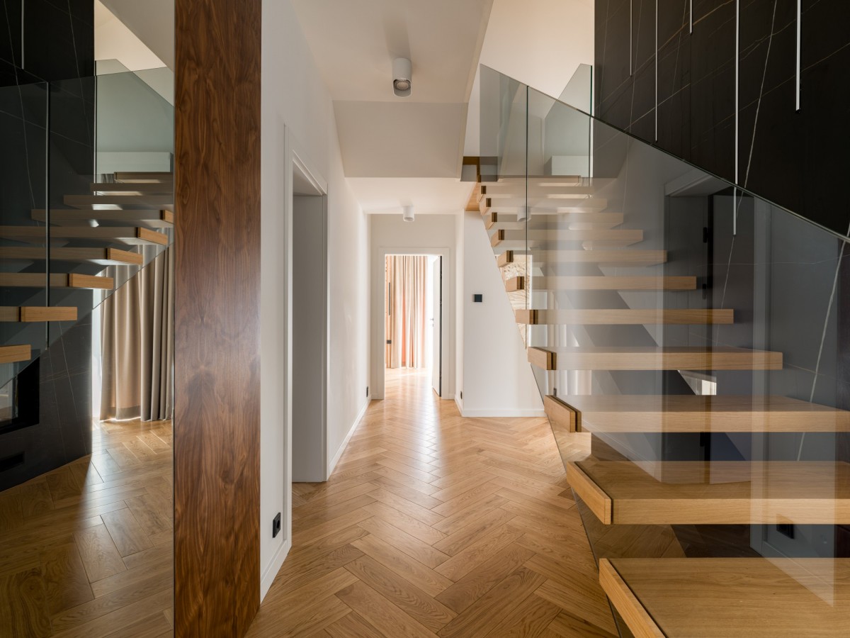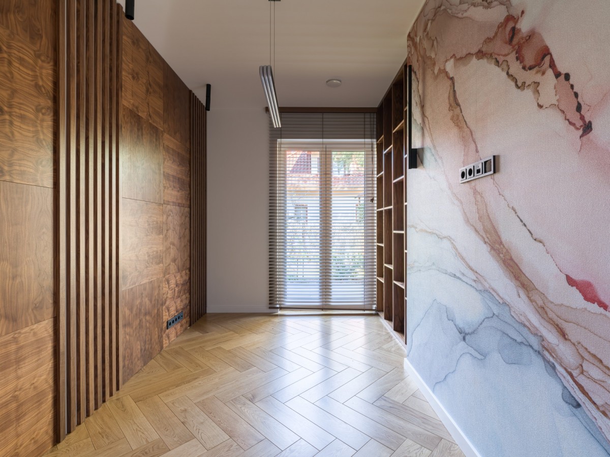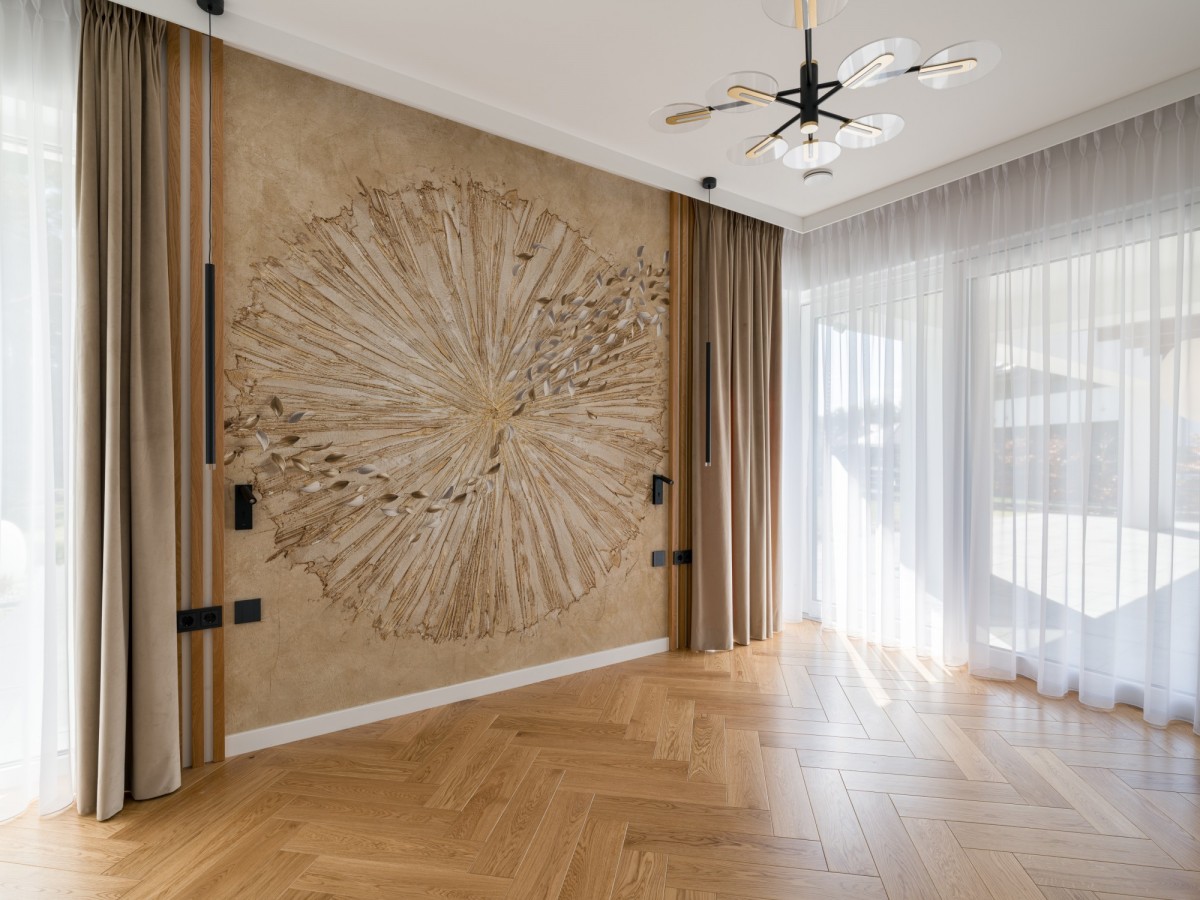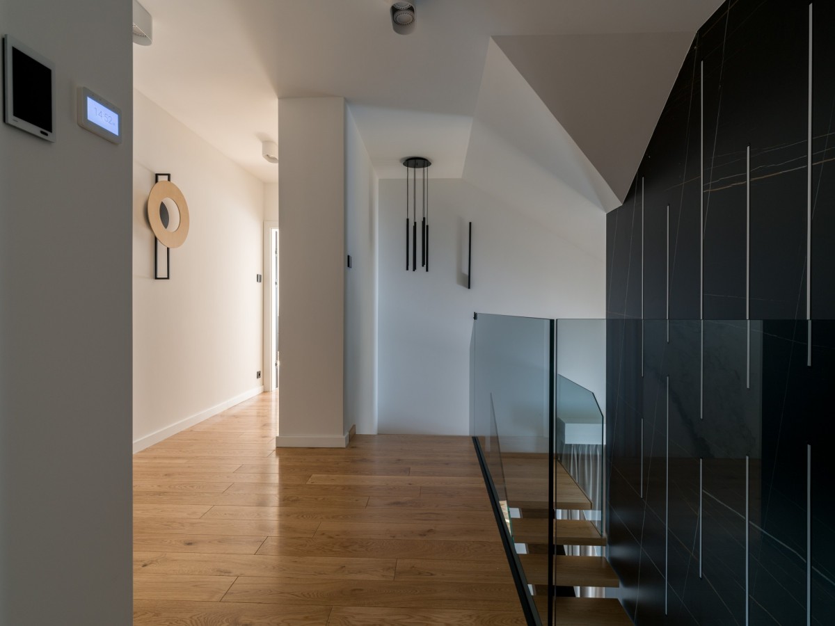 Dom wykończony według projektu architekta, z dbałością o spójność stylistyczną i funkcjonalność.